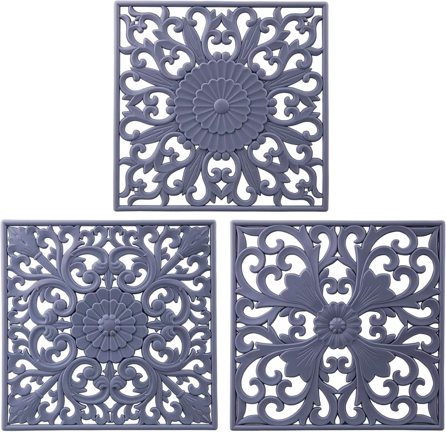 • DECORATIVE HOME AND KITCHEN - 7.09*7.09*0.2 inch grey silicone trivet mats set has 3 carving-shaped designs to decor your home, kitchen decor for counter. Great for granite and quartz countertops, kitchen counter, wood kitchen and dining tables. Practical and useful hot mats for kitchen, countertop, table but also work great to enhances the decor to your dinner room. Sufficient quantity allows you to use and replace for daily life.