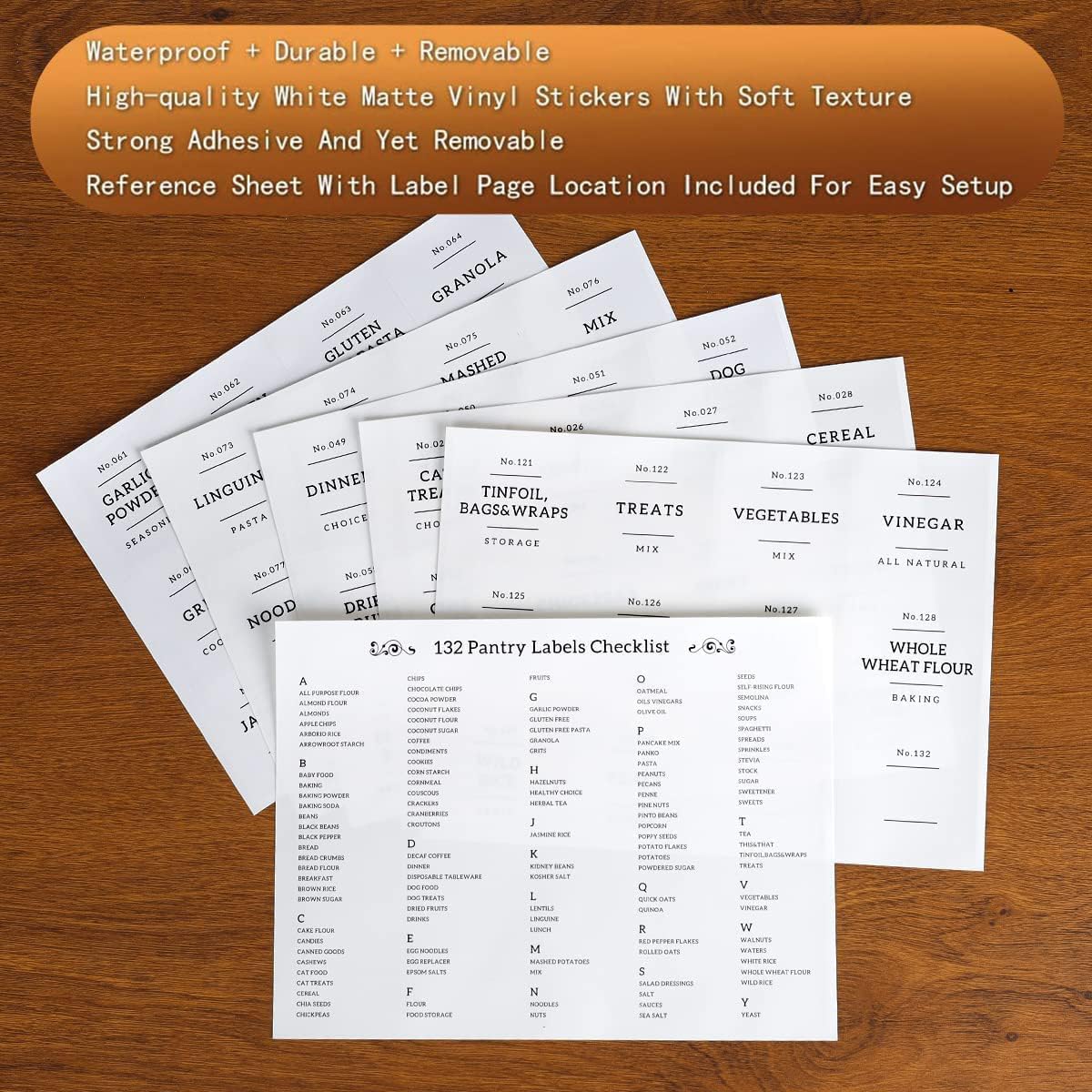 • 【PERFECT FOR PANTRY】132 Kitchen pantry labels for glass pantry storage containers with lids to keep your food fresh and pantry tidy. Minimalist labels are black text on white food labels stickers suitable for all airtight glass canisters. Pantry decal organization labels are preprinted on premium waterproof vinyl stickers that won't tear or peel off but can easily be removed.