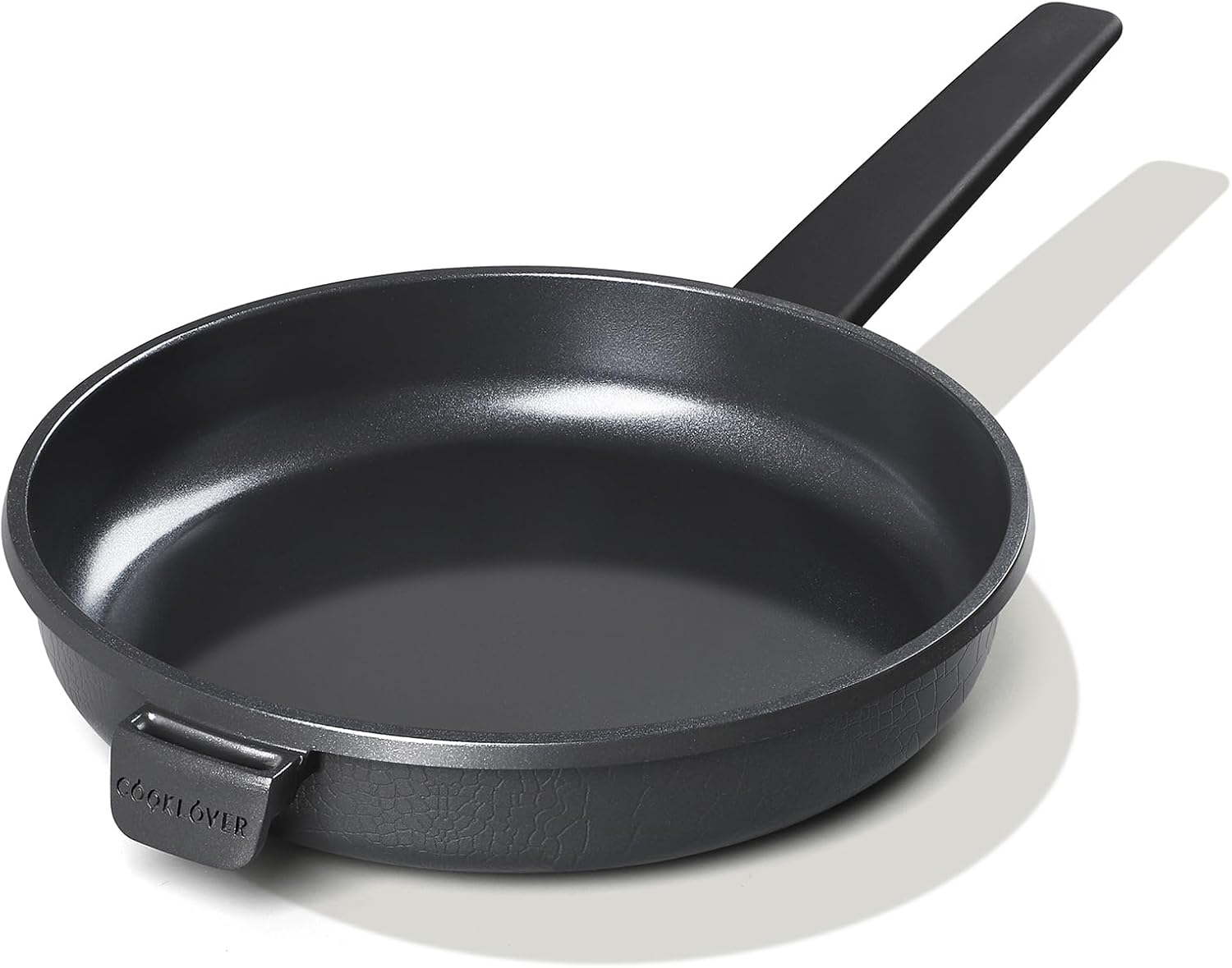 • ✅Ergonomic Bakelite handle: COOKLOVER's fry pan builds with Eye-catching heat resistant soft touch silicone robust Bakelite handle with elegant solid color design. Stay cool and comfortable. Easy to maneuver, Safe & Anti-scald. Do not put this handle directly on the fire or do not heat it for a long time.