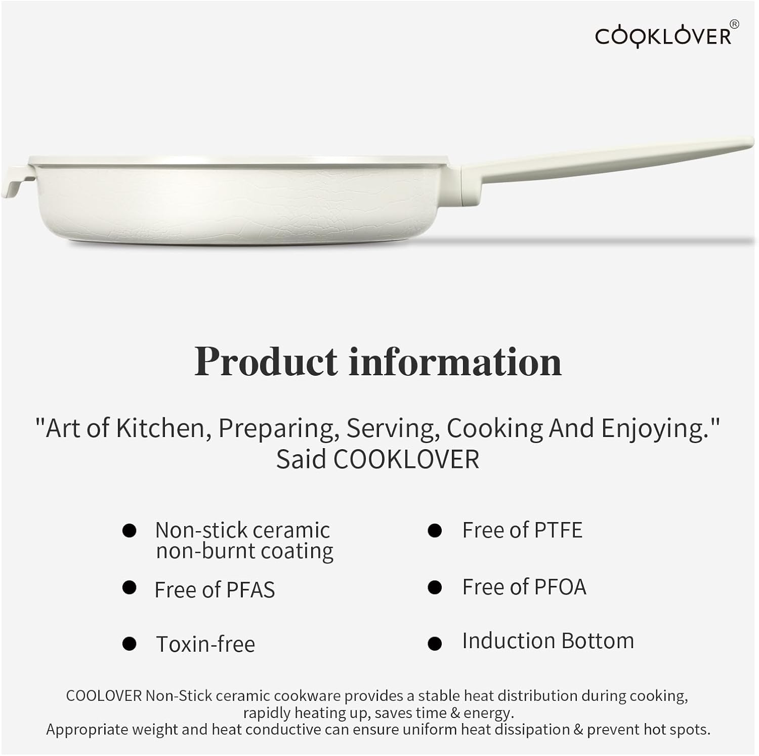 • ✅Ergonomic Bakelite handle: COOKLOVER's fry pan builds with Eye-catching heat resistant soft touch silicone robust Bakelite handle with elegant solid color design. Stay cool and comfortable. Easy to maneuver, Safe & Anti-scald. Do not put this handle directly on the fire or do not heat it for a long time.