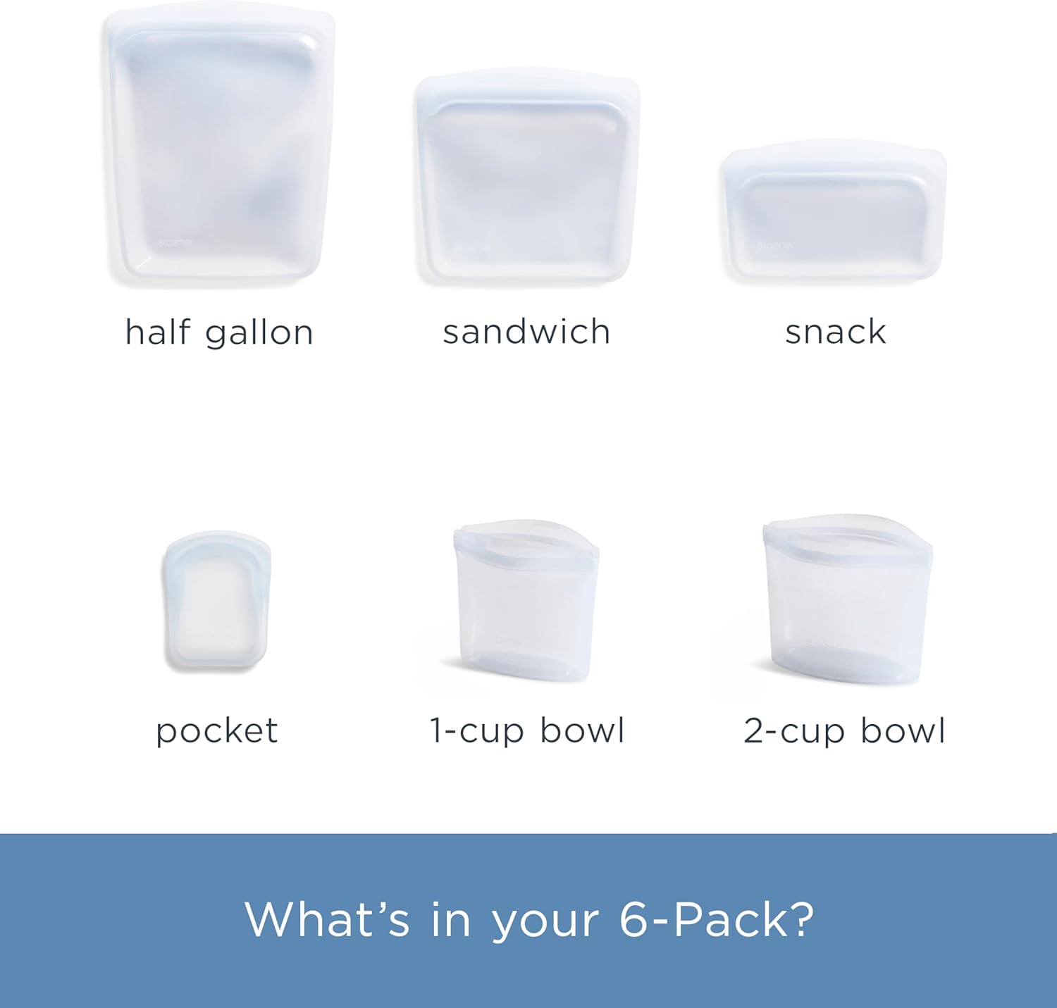 • CONTAINS: 6 Stasher Reusable Silicone Bags in the color Clear. Includes 1 Cup (8 Fl Oz) and 2 Cup (16 Fl Oz) Bowls, 1 Pocket (4 Fl Oz), 1 Half Gallon (64 Fl Oz), 1 Sandwich (28 Fl Oz), and 1 Snack (12 Fl Oz) Bags.