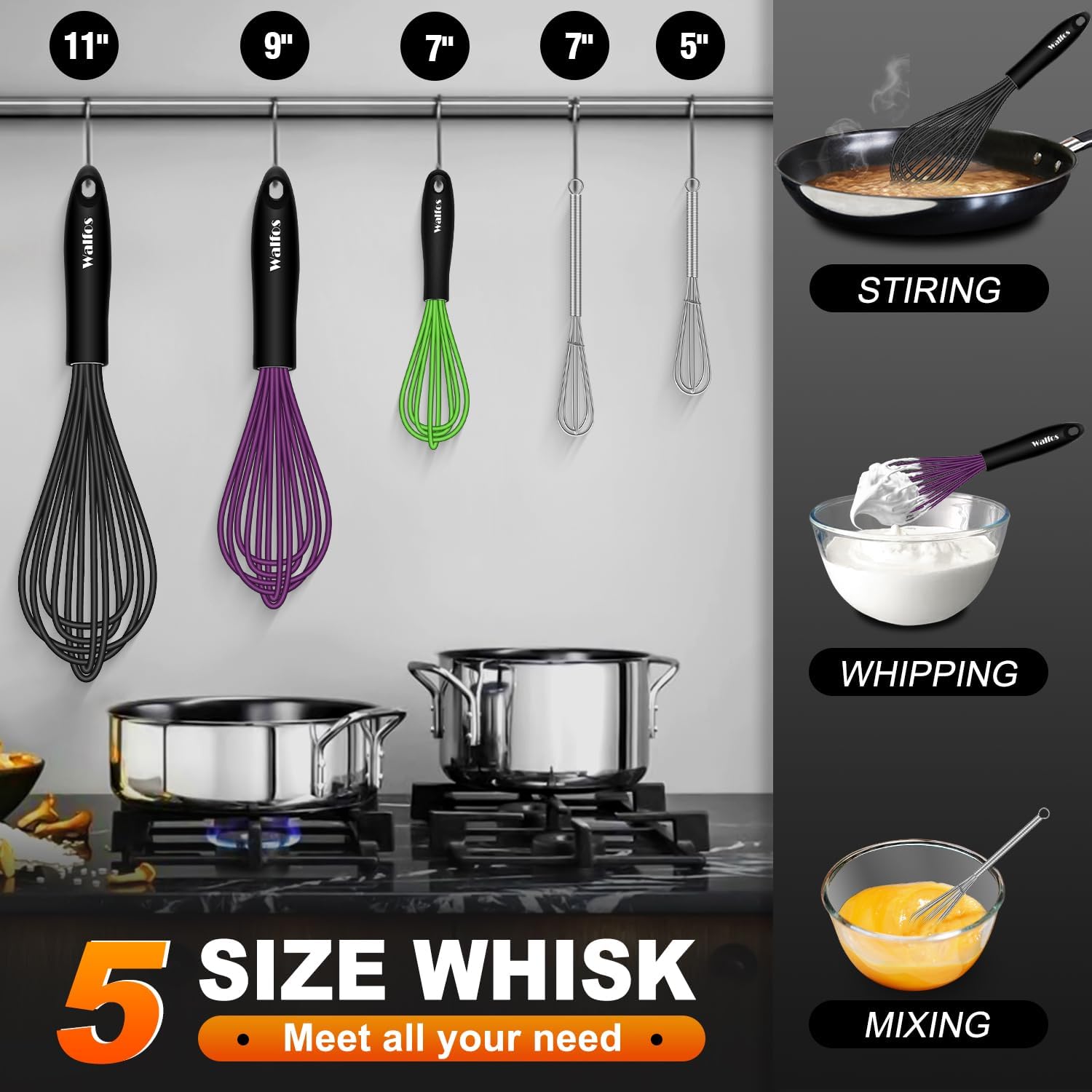 Walfos Whisks,Silicone Whisk Non Scratch,Whisks for Cooking,BPA free and Dishwasher Safe.Nice for Mixing and Beating.5pcs whisk set (5+7in mini whisk +7+9+11in balloon whisk)