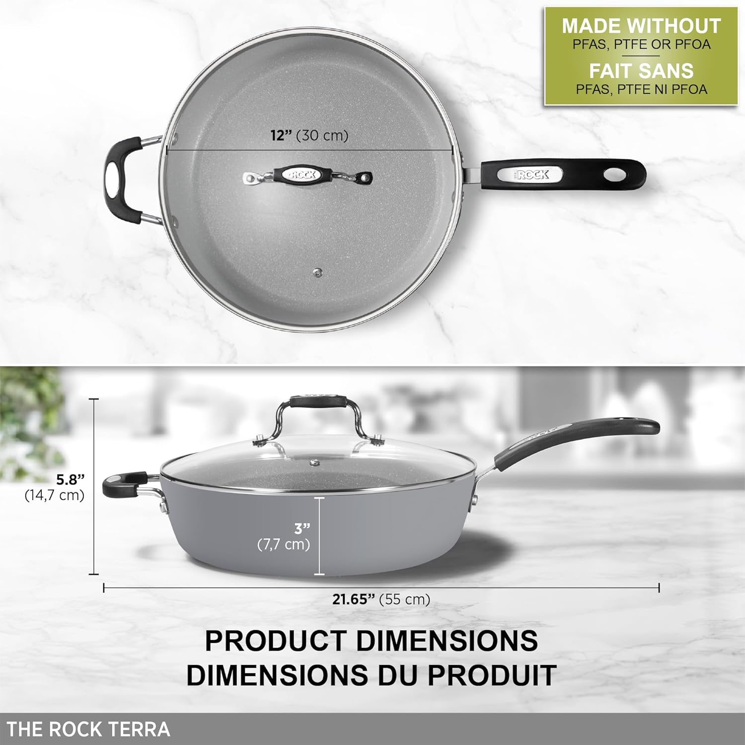 • Starfrit The Rock Terra Collection 12" Deep Fry Pan includes a lid and features a ceramic non-stick surface free from PFAS, PTFE, and PFOA.