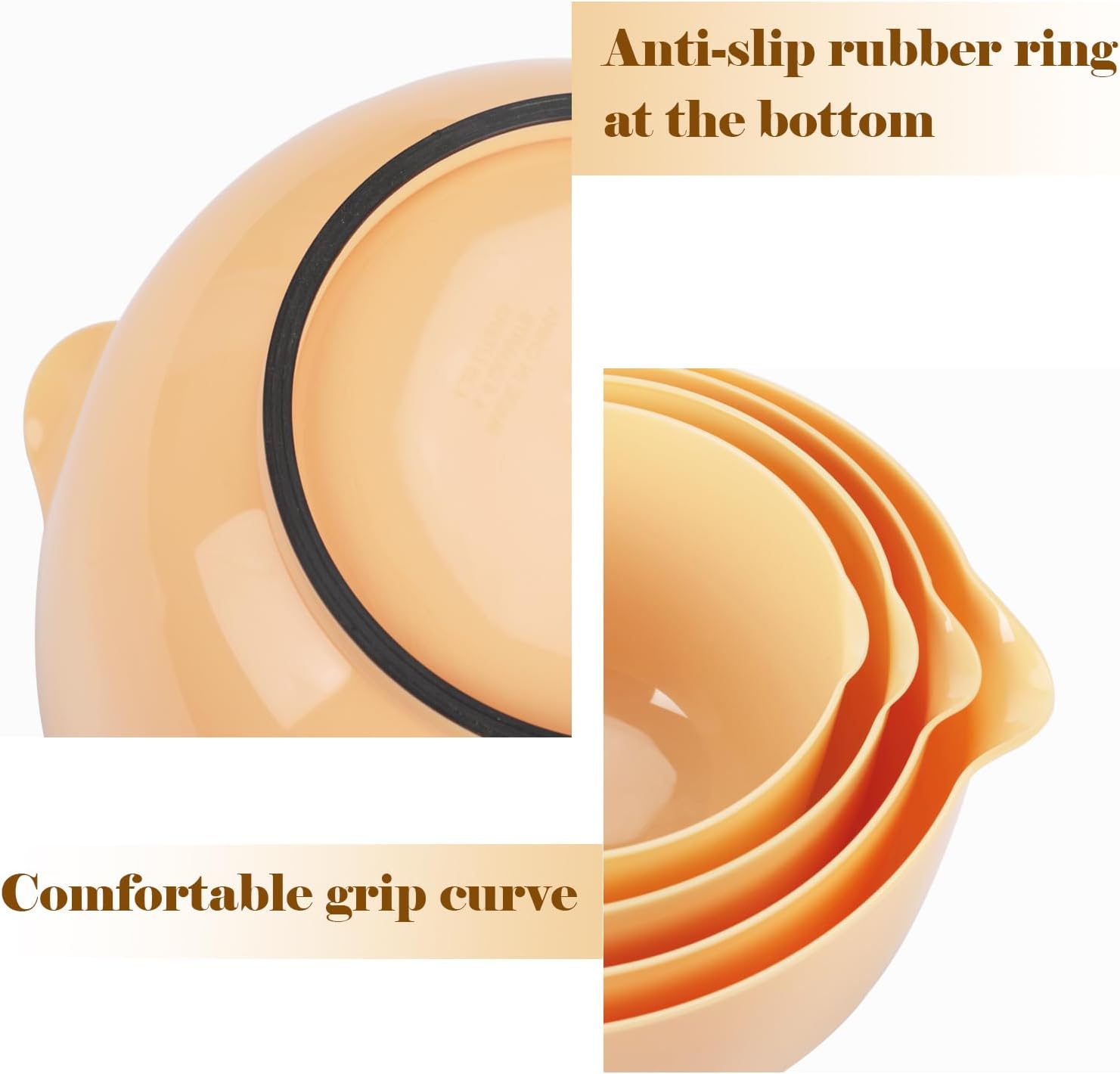 • 【Non-Toxic & Food Safe Material】Our mixing bowl is made of food-grade material, BPA-free and odorless, ensuring the absolute food safety in prepping, washing, baking, mixing and serving. Safe for use in microwave, Note: Please do not overheat as it may shorten the product life. (Temperature Resistance: -20℃~90℃/-4℉~194℉)
