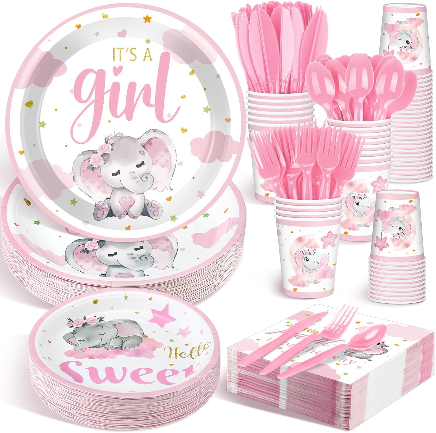 Dandat 350 Pcs Baby Shower Plates Set Baby Shower Party Supplies Serves 50 Tableware Sets Include Plates Napkin Cup Forks Knives Spoons Disposable Dinnerware(Elephant,Pink)