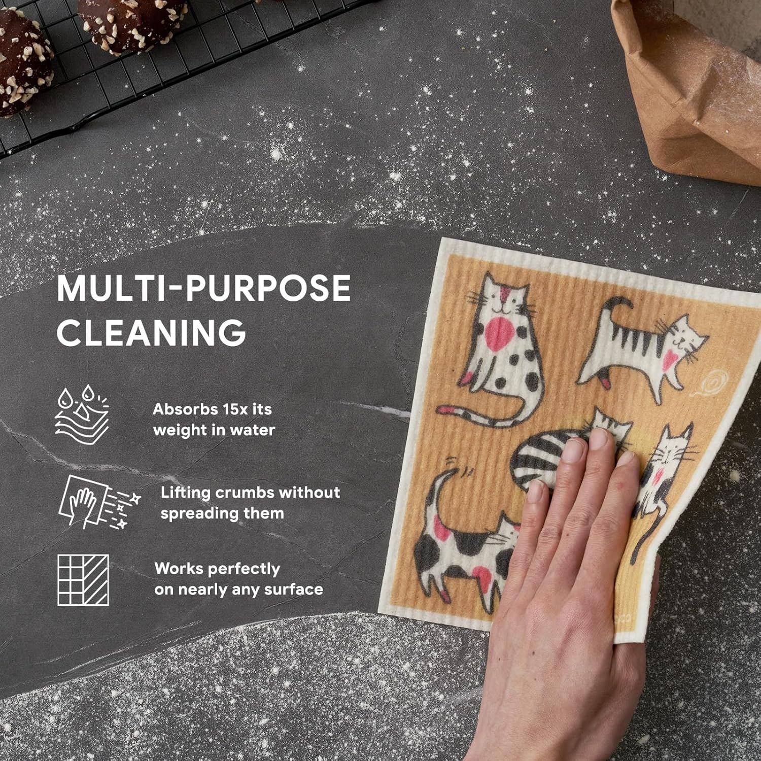 RECYCO Swedish Dishcloths for Kitchen | 6 Pack Cuddly Cats Washable Dish Rags | Cellulose Reusable Cleaning Paper Towels | Absorbent Counter Dish Cloth Sponge Kitchen Wipes, 8" L x 7" W