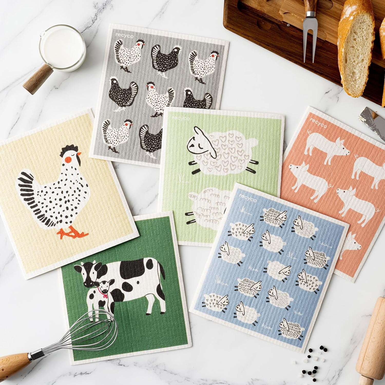 RECYCO Swedish Dishcloths for Kitchen | 6 Pack Farmhouse Friends Washable Dish Rags | Cellulose Reusable Cleaning Paper Towels | Absorbent Counter Dish Cloth Sponge Kitchen Wipes, 8" L x 7" W