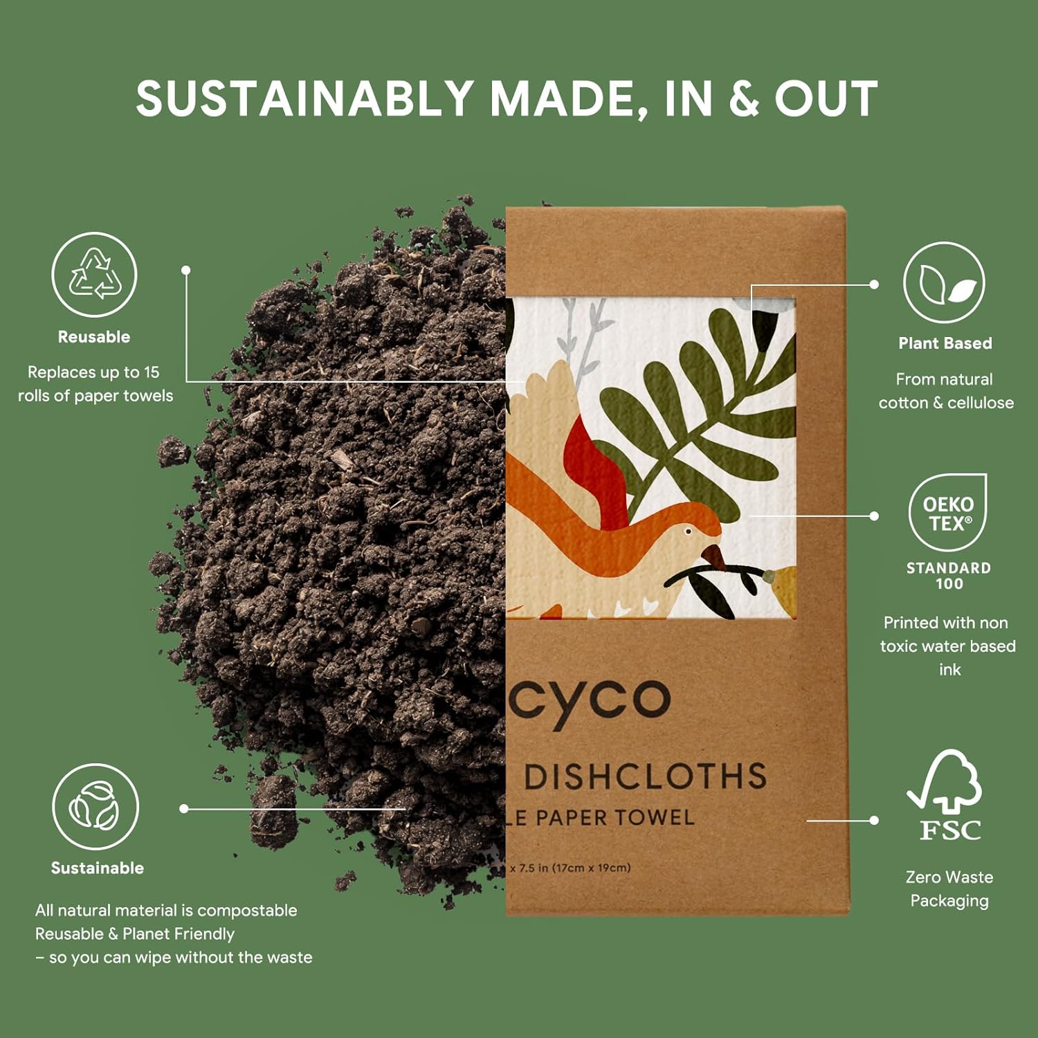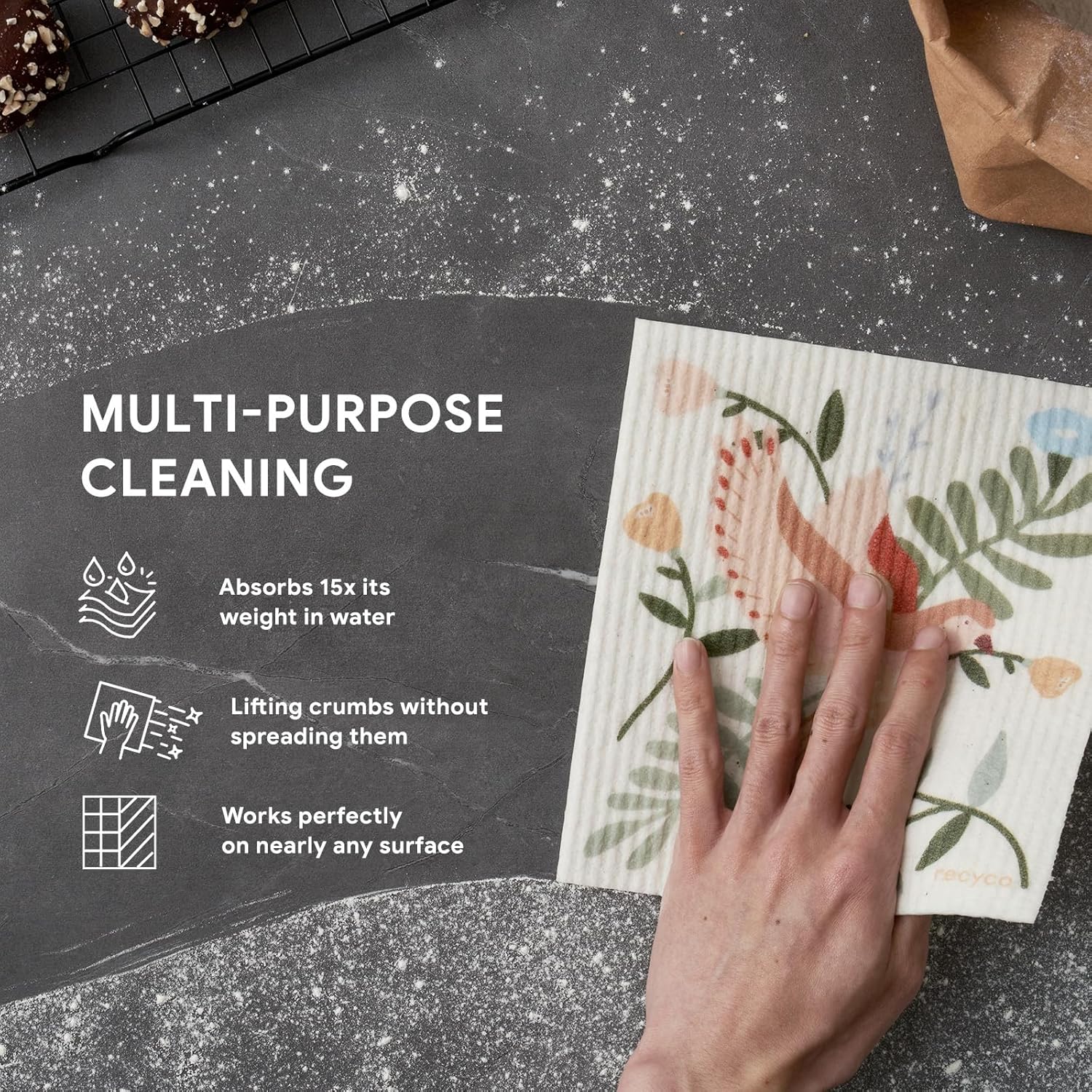 RECYCO Swedish Dishcloths for Kitchen | 6 Pack Birdsong and Blooms Washable Dish Rags | Cellulose Reusable Cleaning Paper Towels | Absorbent Counter Dish Cloth Sponge Kitchen Wipes, 8" L x 7" W
