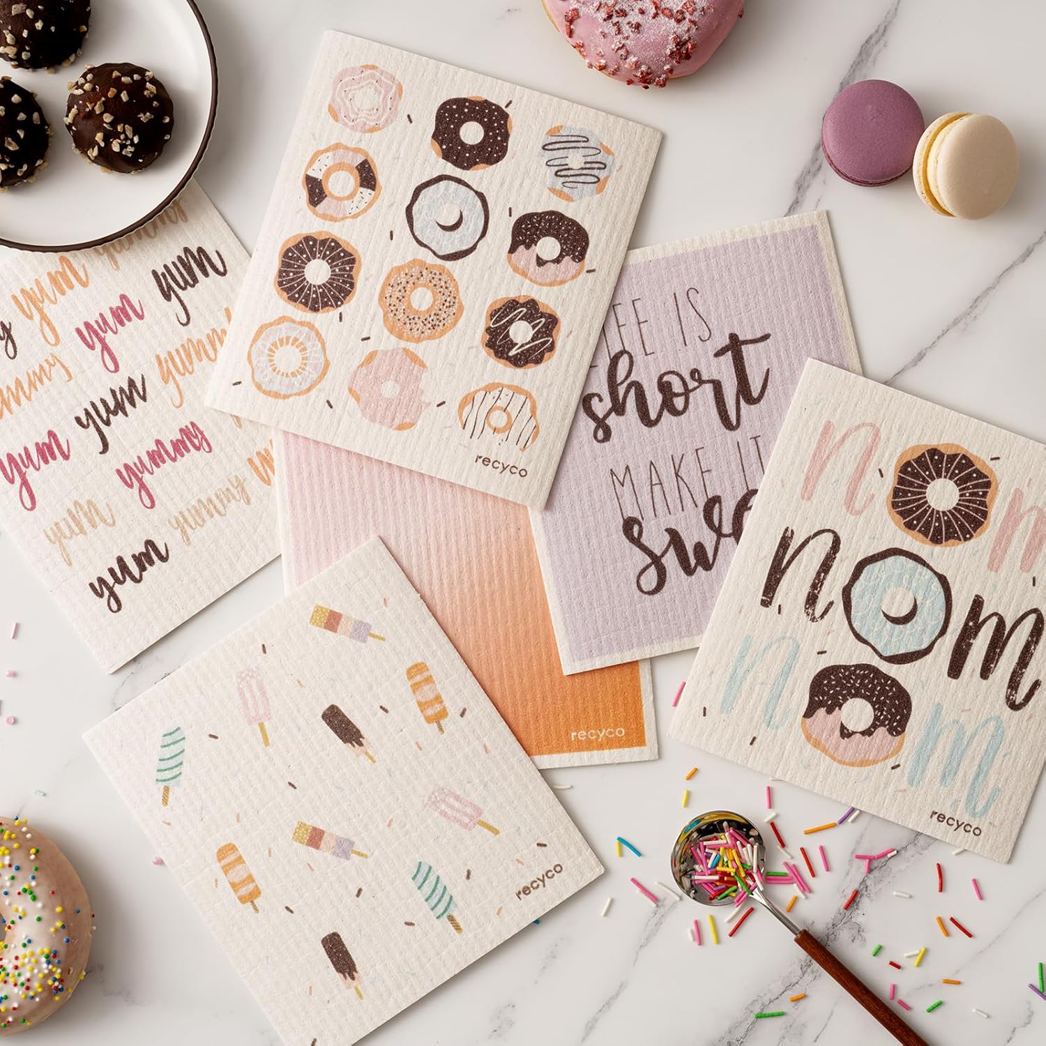 RECYCO Swedish Dishcloths for Kitchen | 6 Pack Sugar Rush Washable Dish Rags | Cellulose Reusable Cleaning Paper Towels | Absorbent Counter Dish Cloth Sponge Kitchen Wipes, 8" L x 7" W