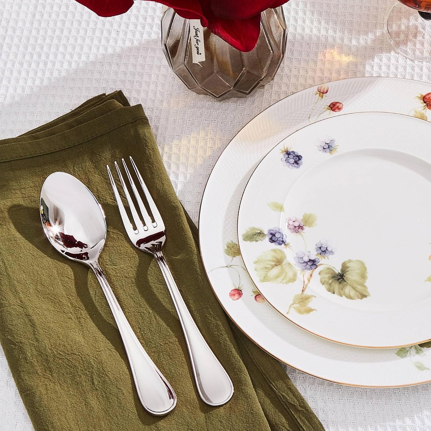 • Excellent Design & Polishing: Design of the silverware set is classic and timeless, with unique shapes and smooth lines,which can be perfectly matched with your existing flatware sets. Multiple times of hand polishing gives it shiny luster after long time use, making it a good choice for gifts. The larger size of these pieces also makes them stand out, adding an extra element of style to your table setting