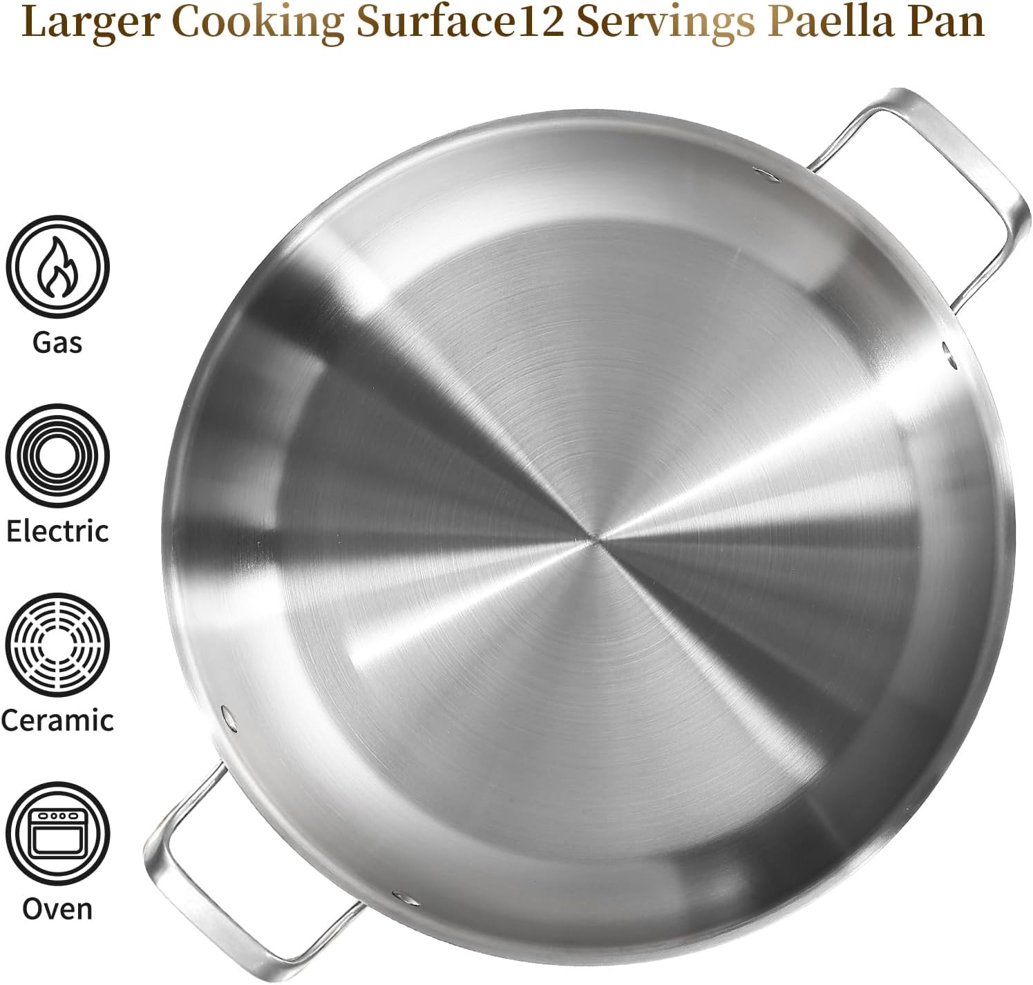 • 【Large capacity cooking】Cook rice and meat to vegetables and seafood, our seafood paella pan does it all. It's your go-to for family gatherings, garden parties, or camping trips, serving 4-8 people effortlessly. Even Heat Distribution: The Tri-Ply stainless steel construction of this pan ensures that heat is distributed evenly across the surface, ensuring that your food is cooked to perfection