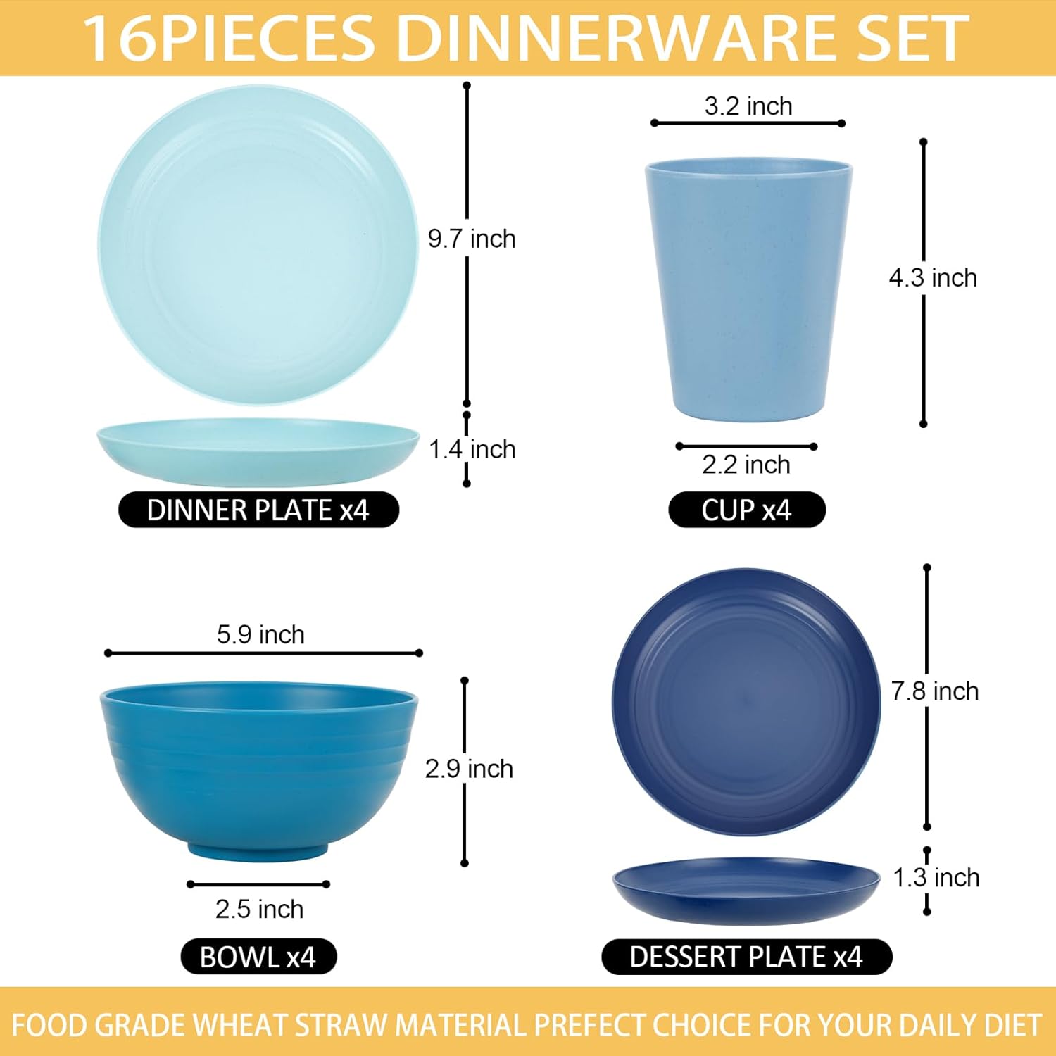 Rubtlamp 16pcs Wheat Straw Dinnerware Set, Unbreakable Plates And Bowls Sets of 4, Plastic Plates Set Reusable (Light Deep Four Colors) Daily