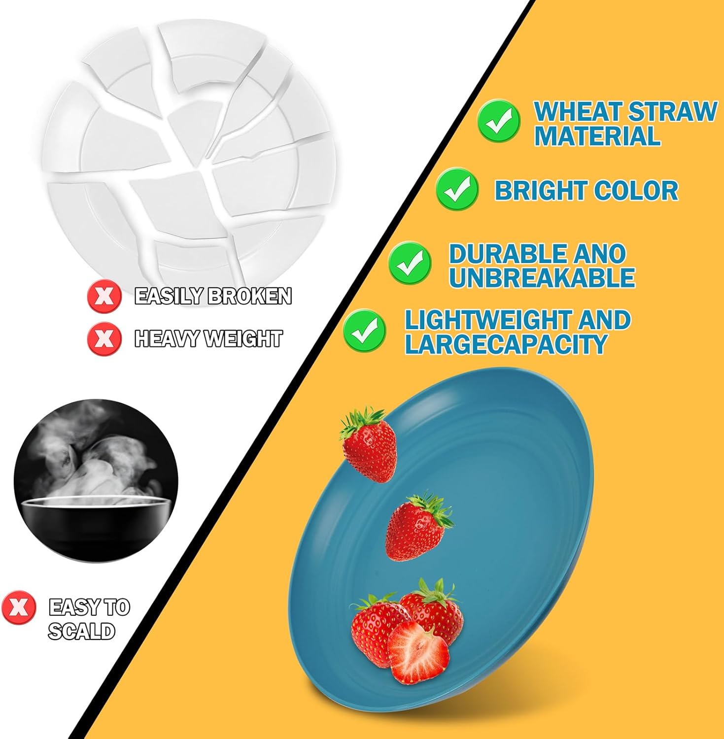 • Reusable And Stackable: Plastic plates, bowls, and cups are reusable, not fragile, and feature a space saving style and smooth circular edge design. Our wheatstraw dinnerware set is stackable, and stacking keeps your countertop tidy.