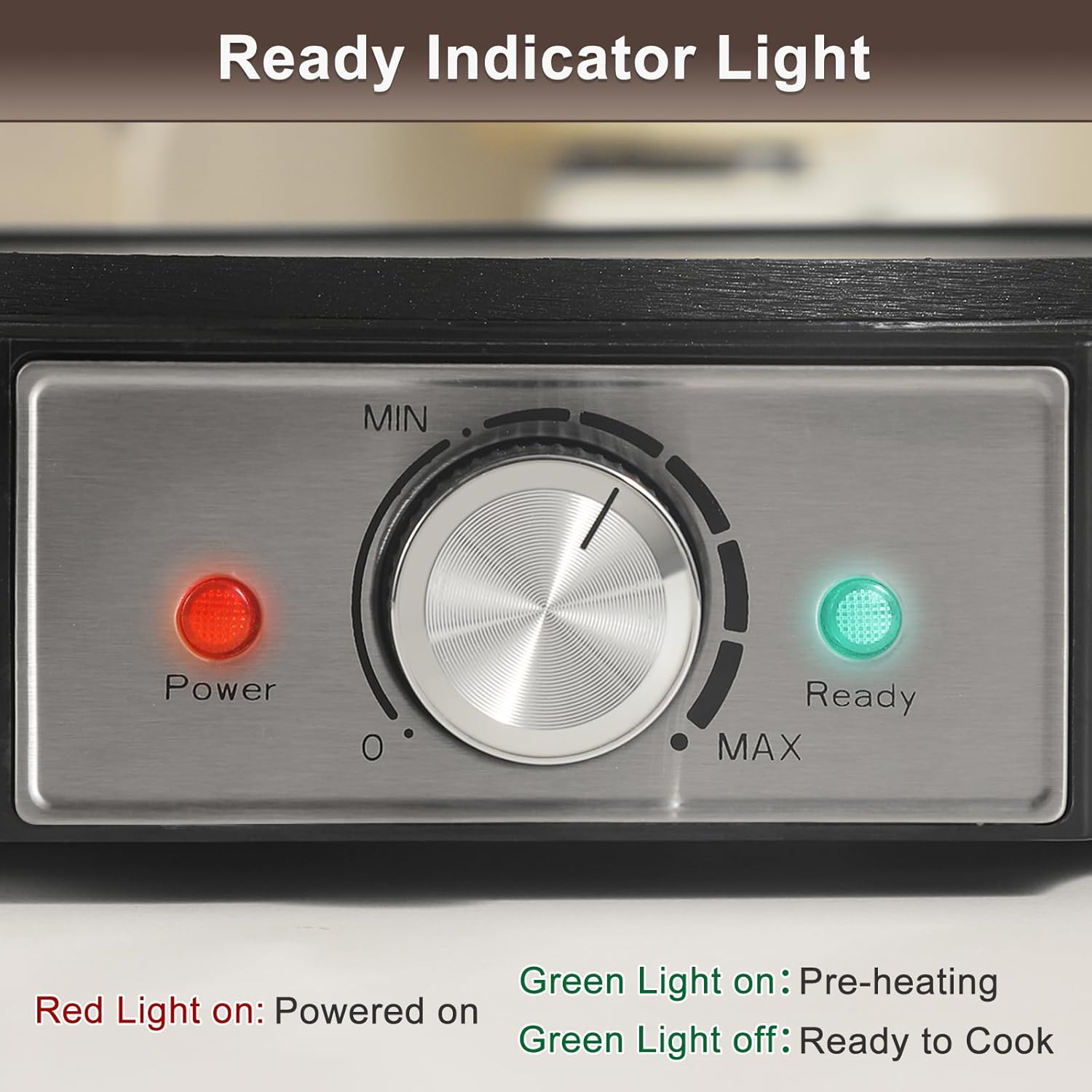 • Precise Temperature Control & Indicator Light: Control the cooking temperature you need at any time, the heat can be adjusted from the minimum to the maximum, the red light indicates that the crepe maker machine is powered on, the green light indicates that the crepe pan is being pre-heated, the green light disappears to indicate that you can start making crepe.