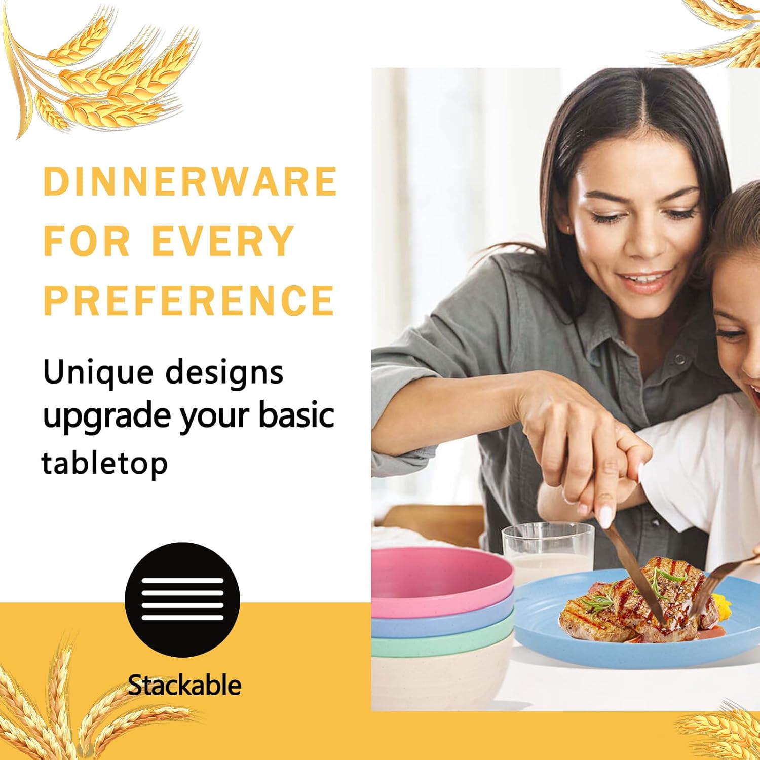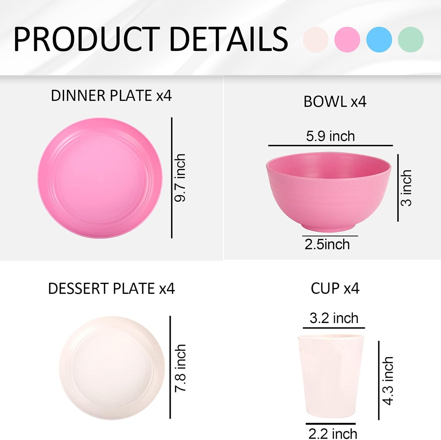 • High End And Fashionable Wheat Straw Dinnerware Set: We know it's hard to believe, but this set of plastic dishes set is not ceramic. Our reusable plastic plates set (pink, green, blue, beige) I is made by mixing wheat straw with non-toxic, food grade plastic. It combines natural materials together to make it less prone to breakage and can be microwave heated. Including (4) 10.5-inch plates, (4) 7.5-inch dessert plates, (4) 24 ounce cereal bowls, and (4) 12 ounce cereal cups.