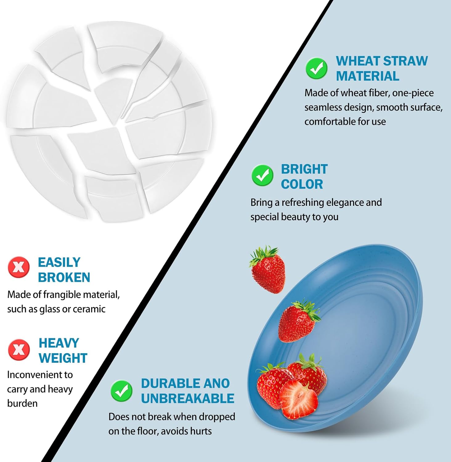 • Safe materials: The wheat straw camping plates set is made of natural straw fibers and food grade safe materials. It is 100% free of bisphenol A and non-toxic. Durable and sturdy, the autumn four-color (White, Light Blue, Navy Blue, Blue) plastic dinnerware set is very sturdy, durable, lightweight, and unbreakable. It will not break or shatter like porcelain or ceramics, even if accidentally dropped or impacted!