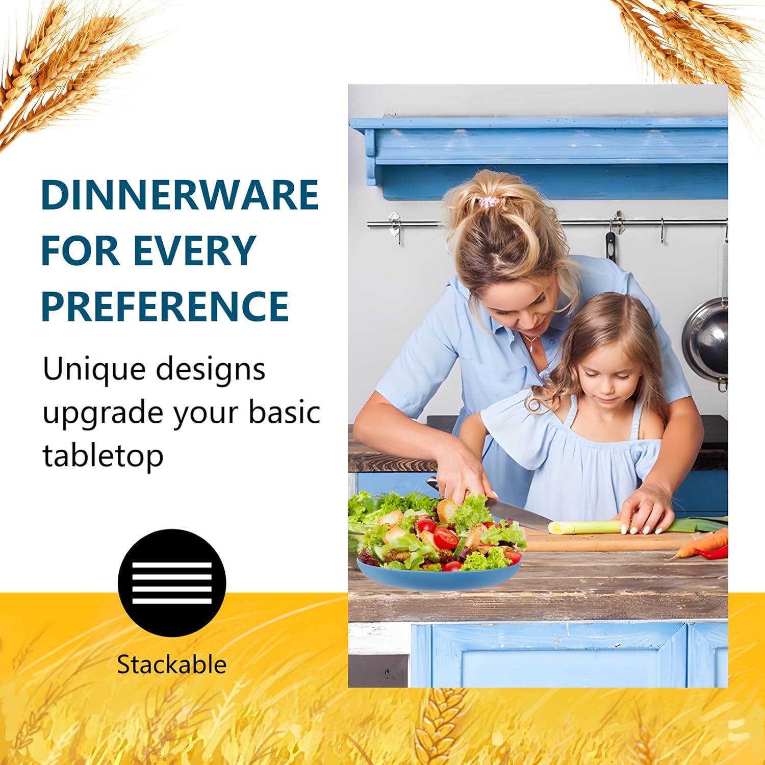 • Reusable and Stackable: Plastic plates, bowls, and cups are reusable, not fragile, and feature a space saving style and smooth circular edge design. Our wheatstraw dinnerware set is stackable, and stacking keeps your countertop tidy.