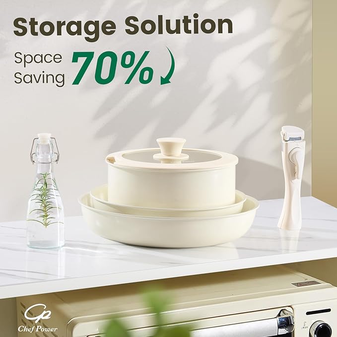• Optimal Storage - Chef Power removable cookware set makes kitchen storage simple, easy to stack and saves 70% space.