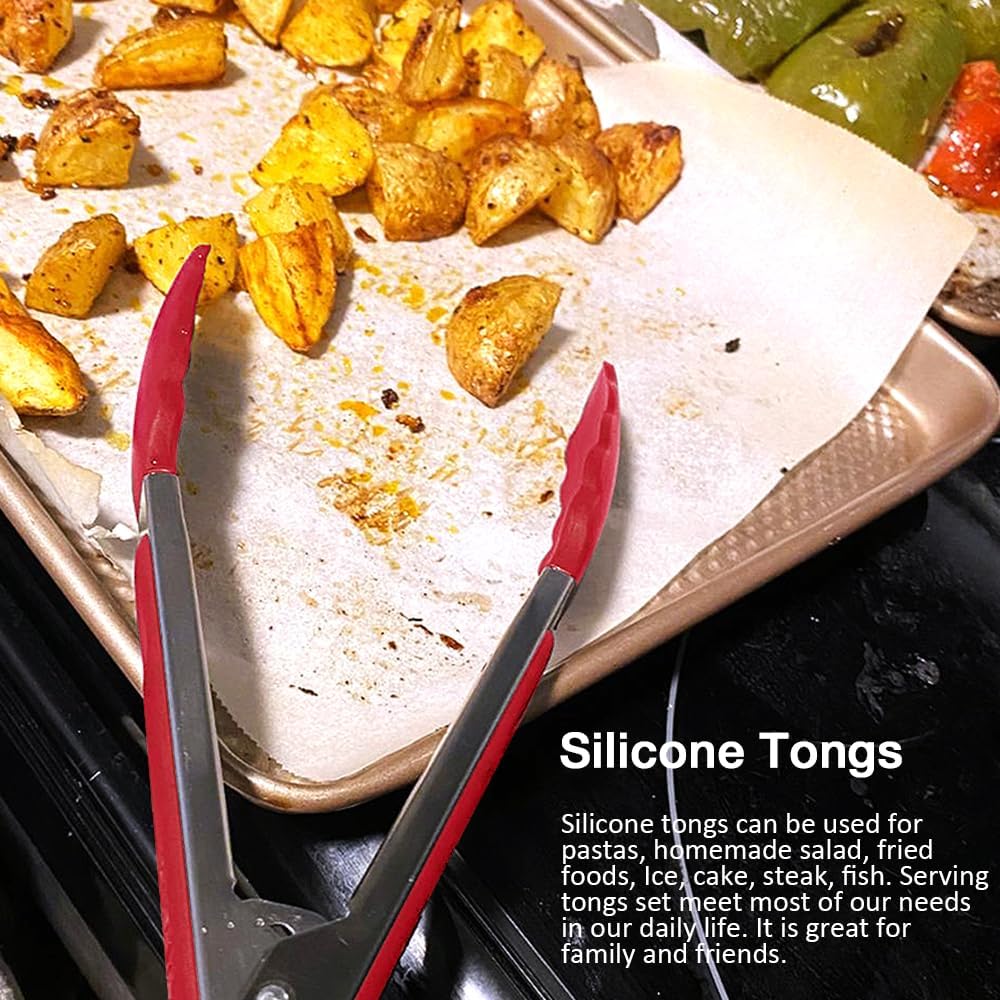 • Set Includes: You will get three red 9 inch silicone cooking tongs, two food tongs, and a spatula tong. Small kitchen tongs are enough to meet your cooking needs. Kitchen tongs set are enough for personal service at the buffet or table