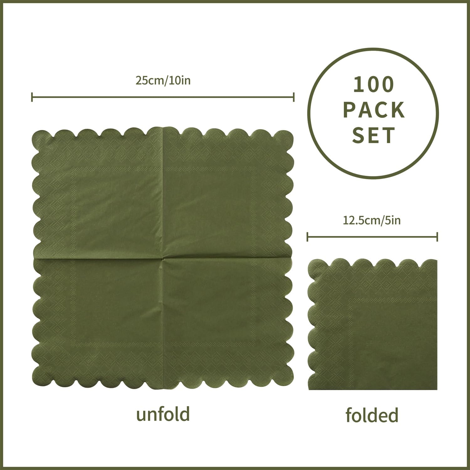 100 Pack Cocktail Napkin 2-Ply Scalloped Edged Dessert Napkins Folded 5 x 5 Inches Disposable Napkins for Dinner Wedding Birthday Party Bridal Anniversary Reception Event (Green)