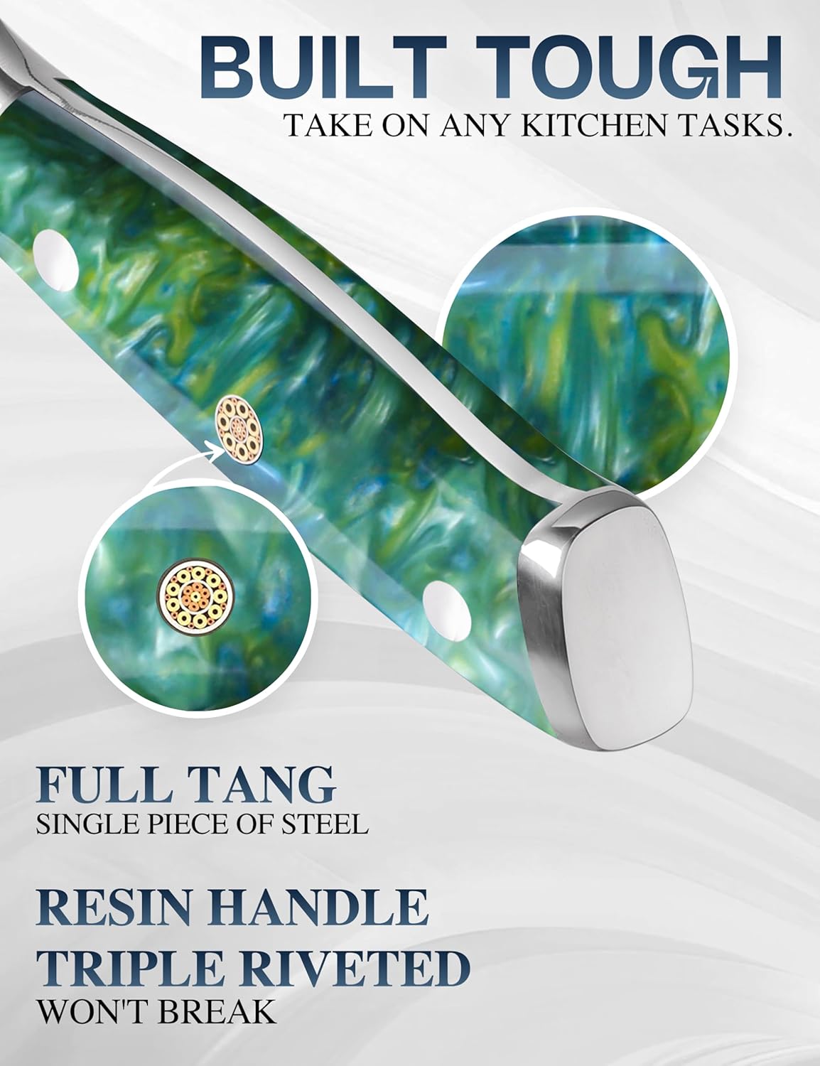 • 【Ergonomically Resin Handle 】These kitchen knives sets features an ergonomic Resin handle that provides a comfortable, non-slip grip. The handle's natural Resin grain makes each knife unique, while the metal frame design and colored nail ensure good stability and balance.