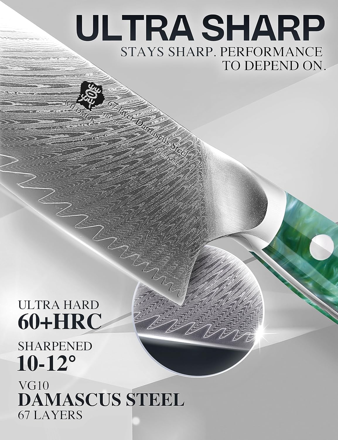• 【High Quality Steel】Our chef knives are made from the damascus steel,the blade has high hardness anti-corrosion,wear-resistant,durable and sharpness. The carbon content is 0.5%,it make the hardness to HRC60±2. With carefully sharpening by our professional craftsmen,the blade edge reached 12-14 degrees per side. Be careful,these knives are extremely sharp!