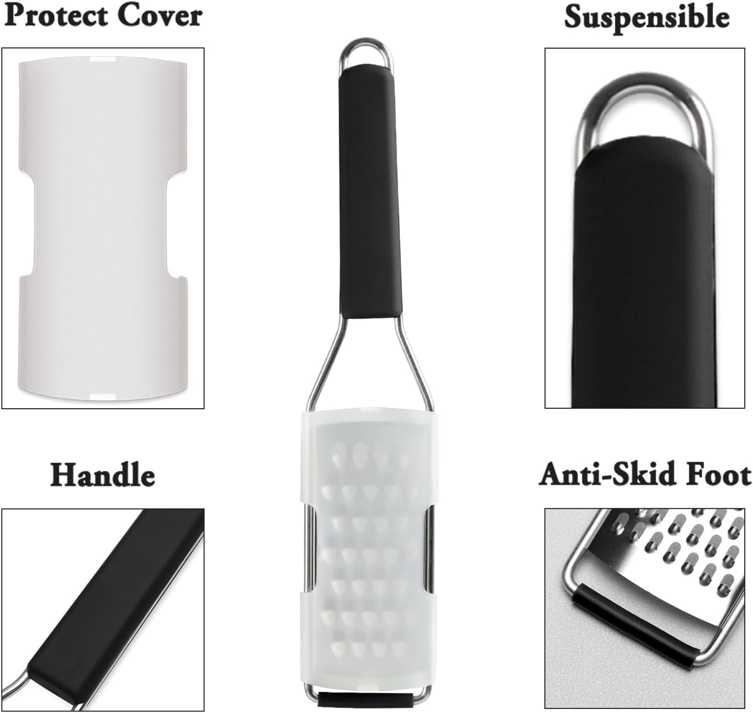 • Superior Process: The food grater is made of 304 stainless steel, and the blade is is very sharp, uniform, sharp, and does not clog easily. The comfortable TPR handle is a good size and feels good to hold. At the bottom of the planer, there are anti-skid bars, which make the operation more stable. Rust resistant.