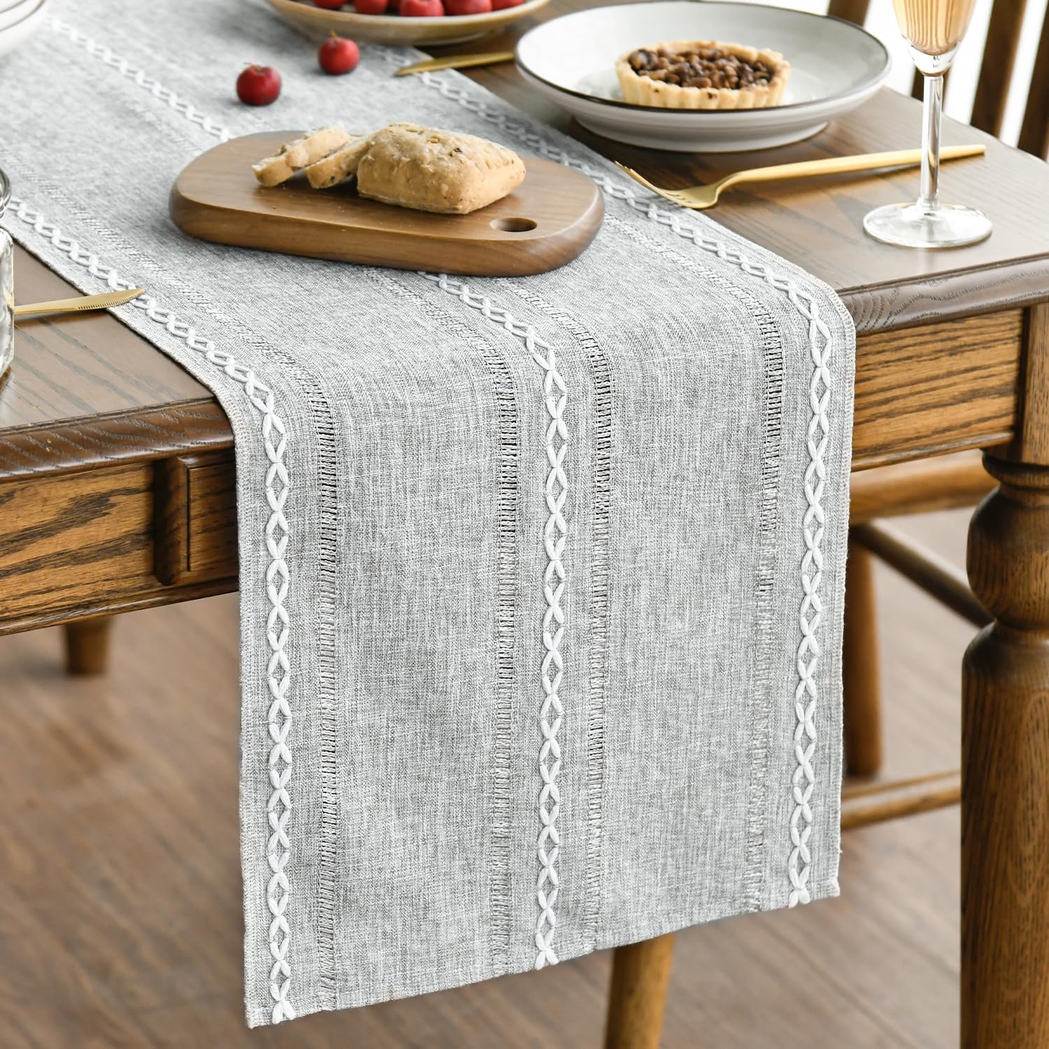 Artoid Mode Grey Rustic Cotton Linen Table Runner, Seasonal Embroidered Hollow Kitchen Dining Table Decoration for Home Party Decor 13x72 Inch