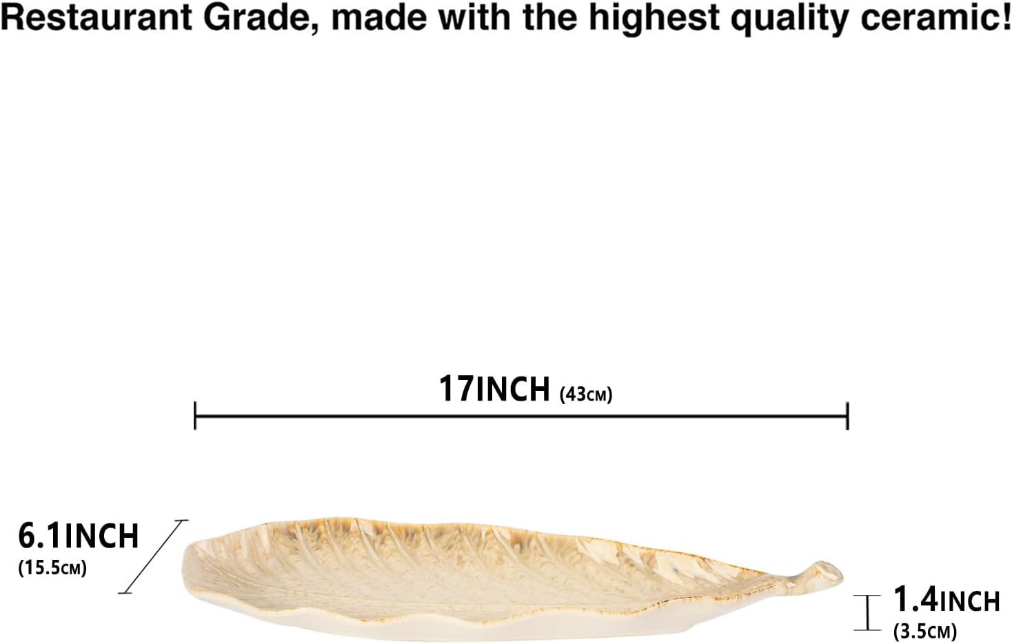 • Serving platter for Entertaining Set of 2, size is 17" x 6.1" x 1.4" inch. Banana leaves type design for home, restaurant or hotel use. Perfect for breakfast, lunch and dinner entertaining, suitable for serve grill, cakes, fruits, snacks, dessert, olives, sandwiches, chips or salad (when hold parties).