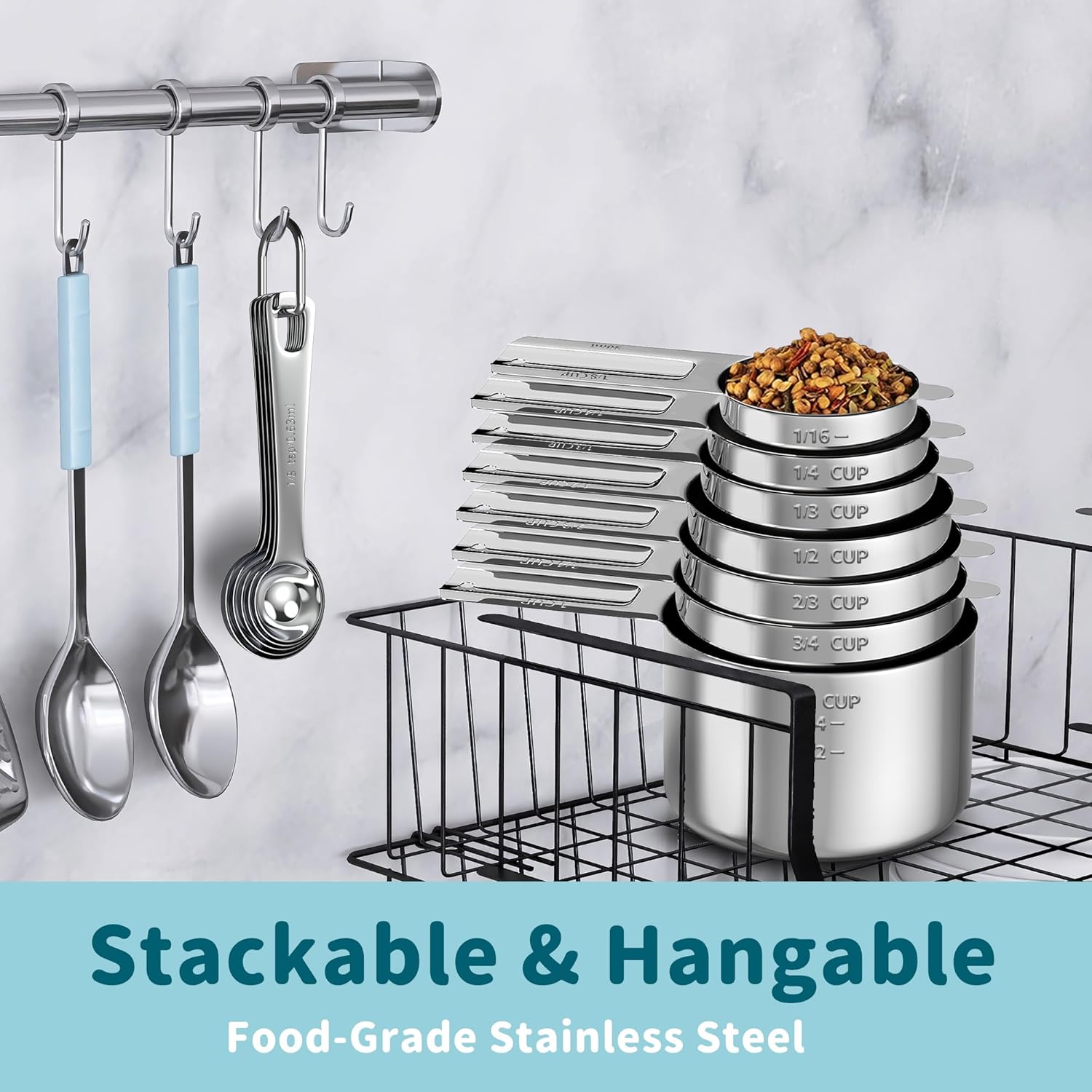 • KITCHEN ORGANIZATION - Keep things neat with our measuring cups and spoons set that comes with a removable stainless steel ring and is stackable. Hang it on a hook or store it in your kitchen drawer, and its sleek, elegant design adds beauty to your kitchen decor.
