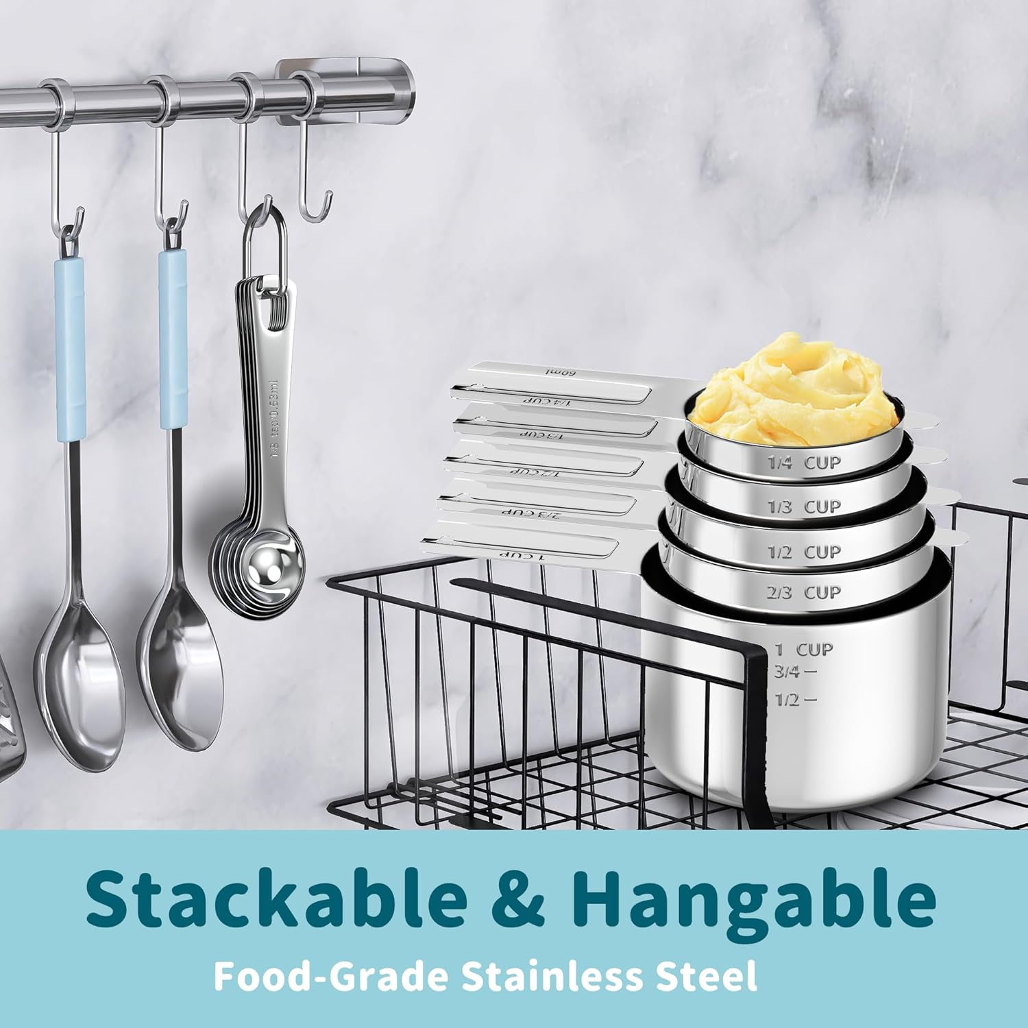 • KITCHEN ORGANIZATION - Keep things neat with our measuring cups and spoons set that comes with a removable stainless steel ring and is stackable. Hang it on a hook or store it in your kitchen drawer, and its sleek, elegant design adds beauty to your kitchen decor.