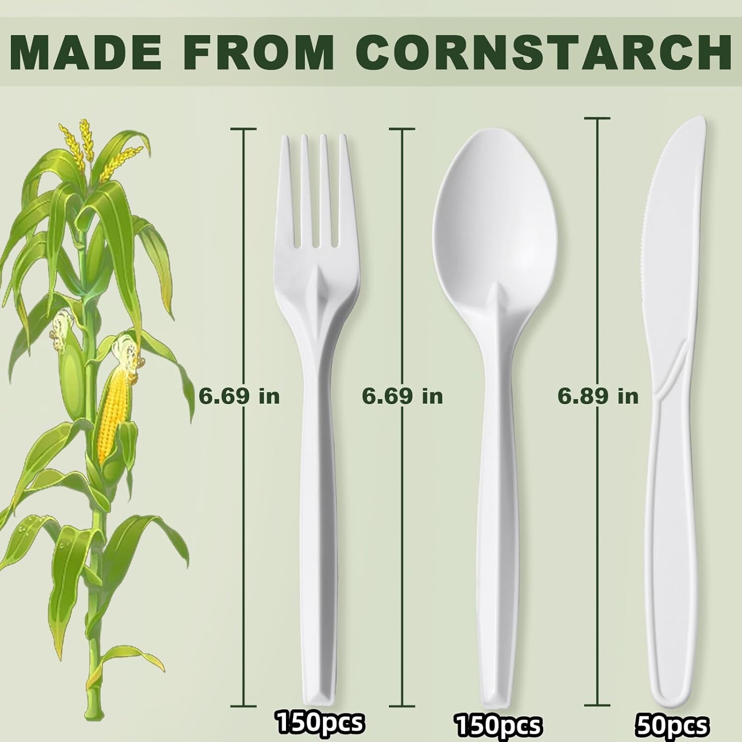 • [Compostable eco friendly cutlery Set]: The disposable utensils set includes 150 Compostable forks, 150 Compostable spoons, and 50 Compostable knives. You can use these disposable tableware sets for parties, birthdays, camping, picnics, daily gatherings, Halloween, weddings, and special events. After the party, you no longer need to worry about the table being dirty and messy, free your hands to go to the dishwasher. Make it easy for you to enjoy entertainment time.