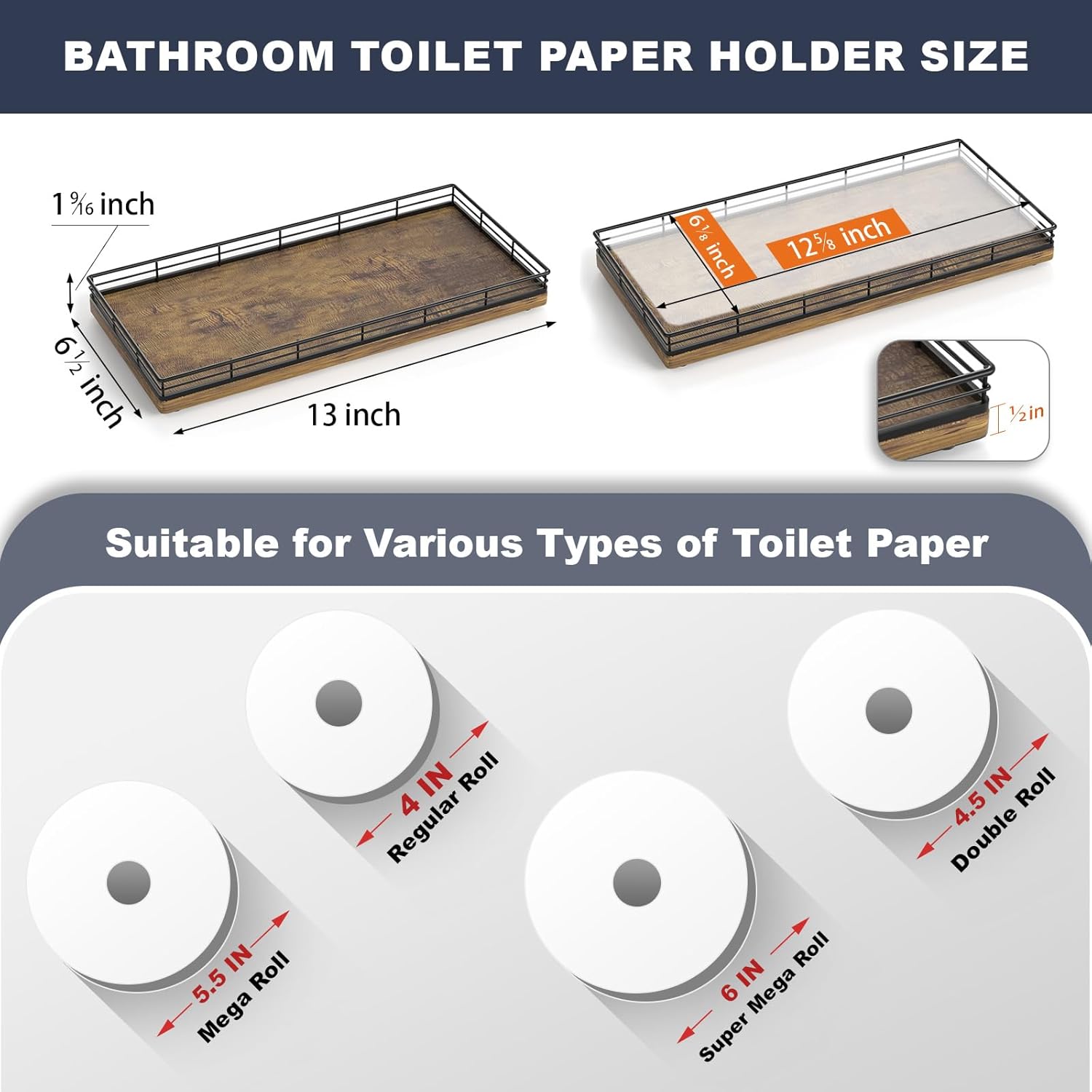 • Unique Charm: This 13 inches large wood rectangle toilet tank tray ensures durability and increased load-bearing capacity; Elevate your space with a unique appearance featuring a combination of iron mesh edges and rustic brown wood board; Distinctive and captivating grain pattern adds an exquisite touch of elegance and sophistication; This bathroom toilet organizer tray blends modern minimalism with farmhouse charm seamlessly
