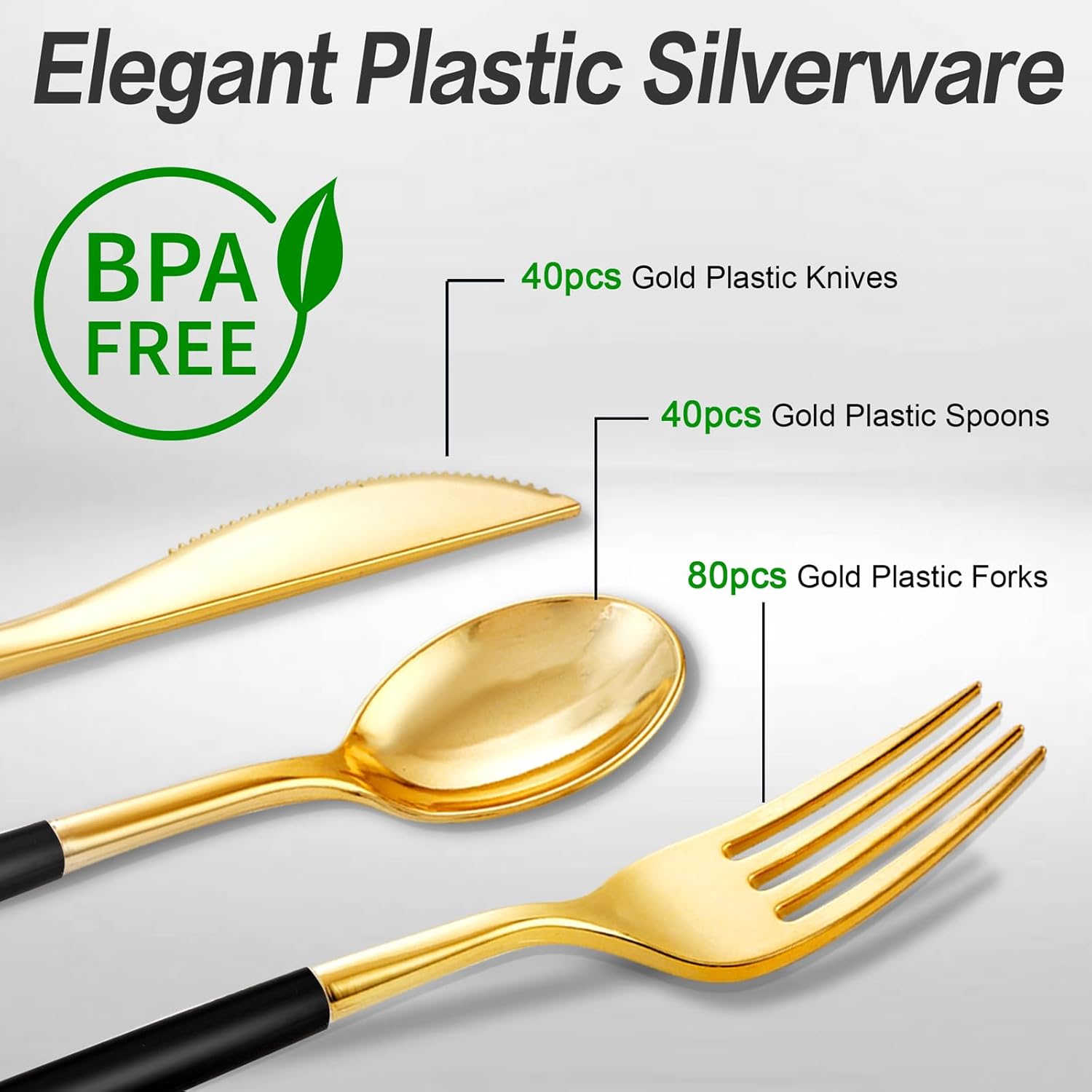 SUT Gold Plastic Silverware (160Pcs) Forks and Spoons Disposable, 80 Gold Plastic Forks, 40 Gold Knives, 40 Gold Spoons, Black and Gold Utensils Set Disposable for Parties, Weddings,New Year,Halloween