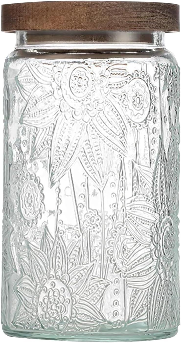 • 【Elegant Vintage Design】Featuring intricate sunflower and begonia patterns, along with random wood grain lids, these Vintage storage jar with wood lid create a unique and retro decorative effect. The transparent glass design allows you to easily check the status and quantity of stored food, making it both practical and aesthetically pleasing for your kitchen counter, pantry, or living room.