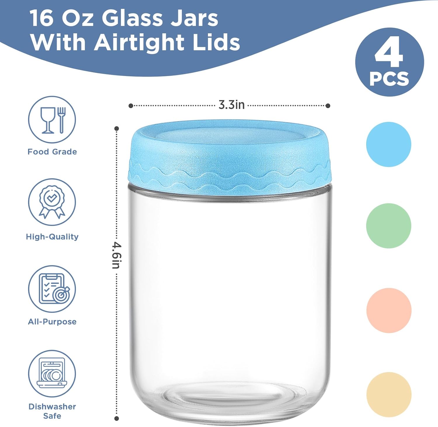 • VERSATILE CREATIVE STORAGE: Explore our set of four 16oz glass jars with airtight lids, perfect for a variety of storage and creative needs. Ideal for everyday yogurt and oatmeal, these mason jars also excel in making homemade jams, pickles, and sauces, blending smoothies, or crafting delicious desserts and DIY projects, they offer a practical and stylish solution for preserving, storing, or displaying your creations.