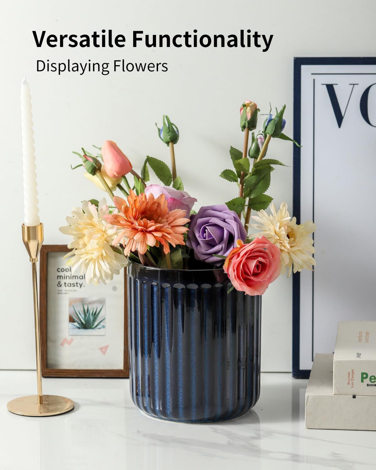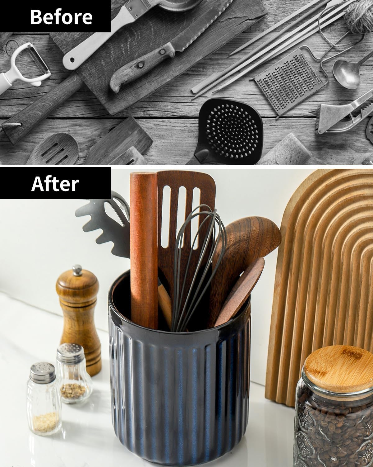 • Textured Elegance: This ceramic navy blue utensil holder features a ribbed texture with lighter flecks, enhancing your kitchen decor and adding a tactile touch that enriches your countertop’s charm