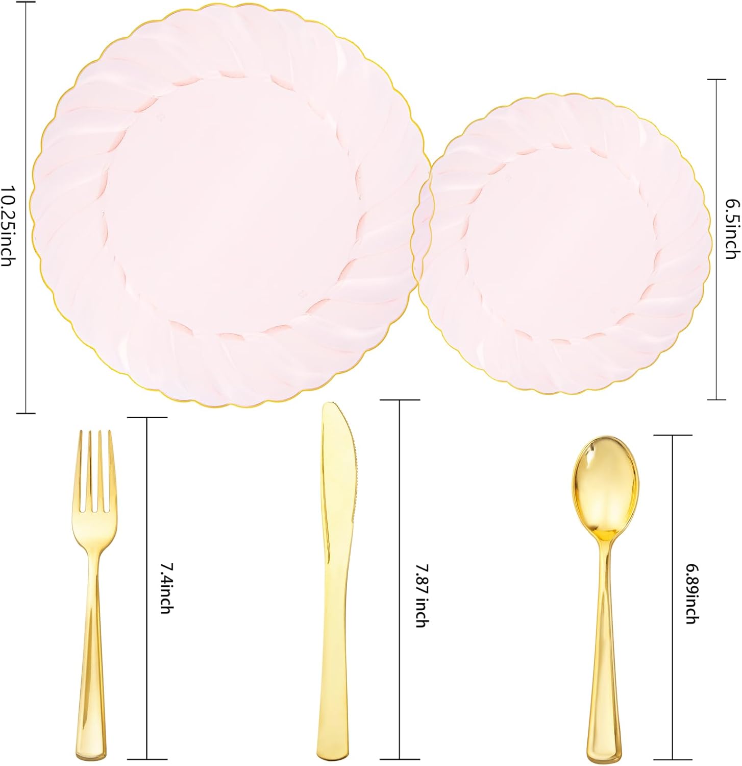• Durable & Heavy-weight: Impress your guests with our disposable pink plastic plates. You can feel the great texture by the weight of silverware in your hand. Our manufacturing process forges durable pink and gold plates that resists breaking, bending and snapping even when meat is served!