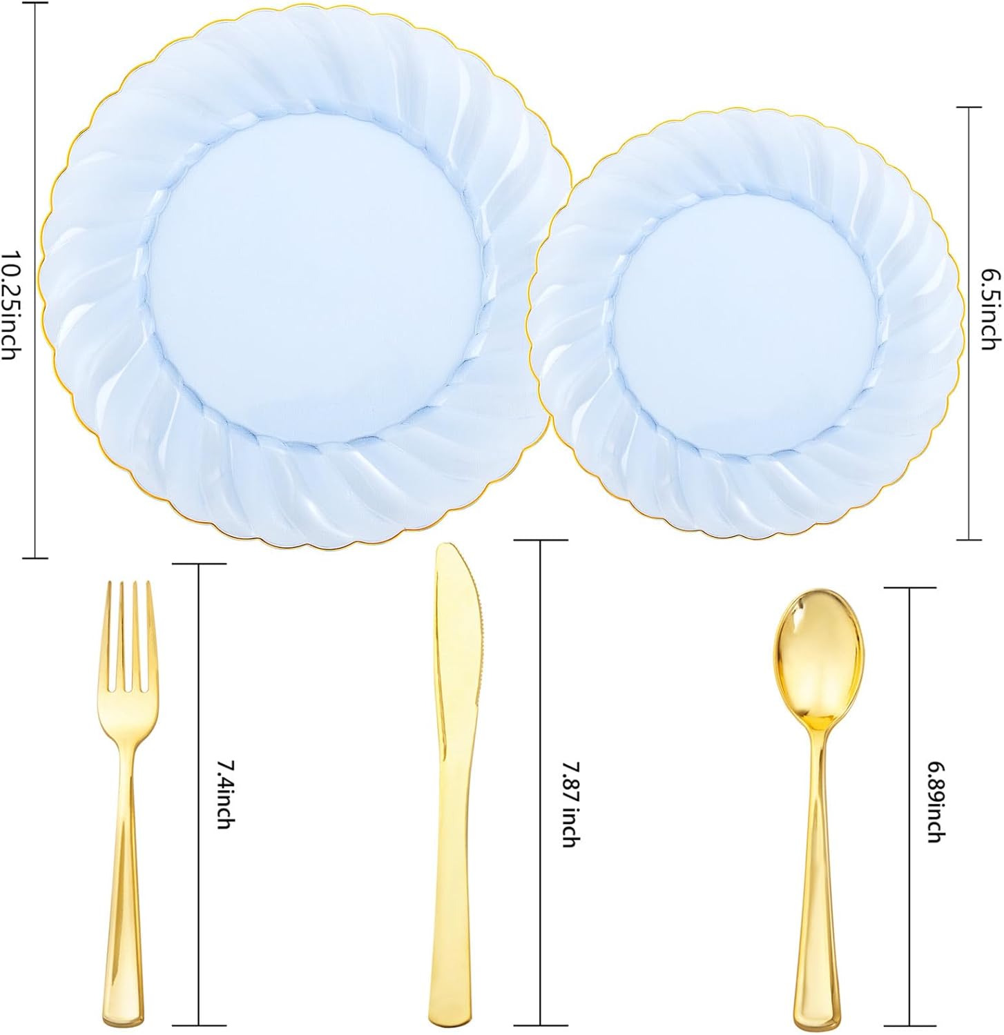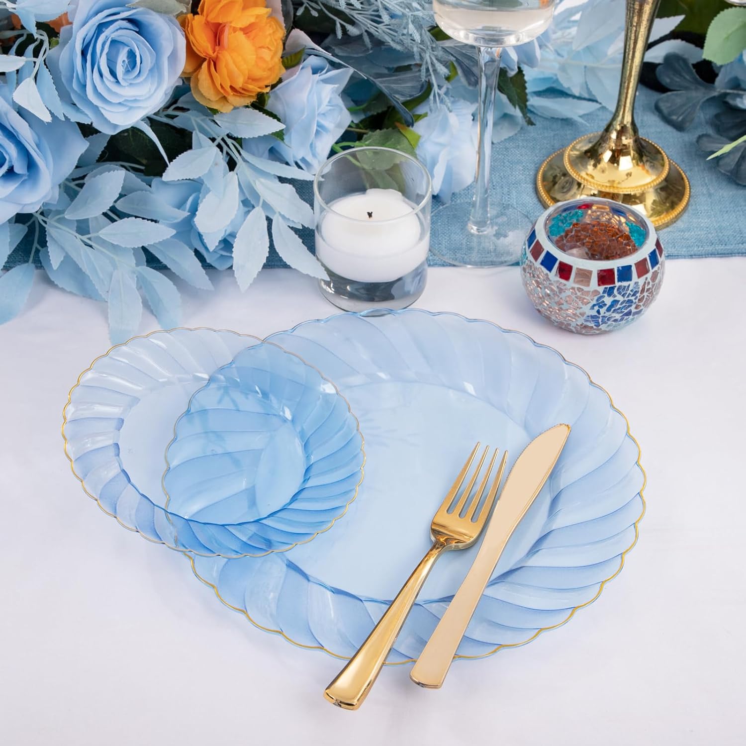 • Premium Quality: Our clear blue and gold disposable plates are made of 100% food-grade plastic and are clean, sanitary and durable enough for your dining needs. Not only do these gold plates disposable offer the convenience of disposables but also without compromising on the premium look and feel, the durable material ensures a hassle-free and stylish dining experience.