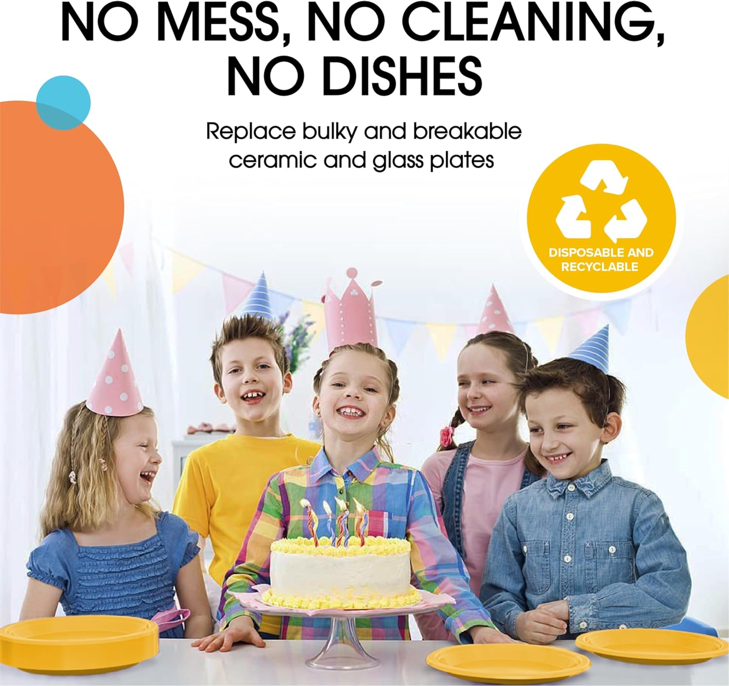• Health & Safety: Our yellow plastic plate set is made with food-safe materials, ensuring the health and safety of your guests. Whether it's for a birthday party or a picnic, you can trust that these disposable plastic plates meet the highest standards of hygiene, providing peace of mind for you and your loved ones.