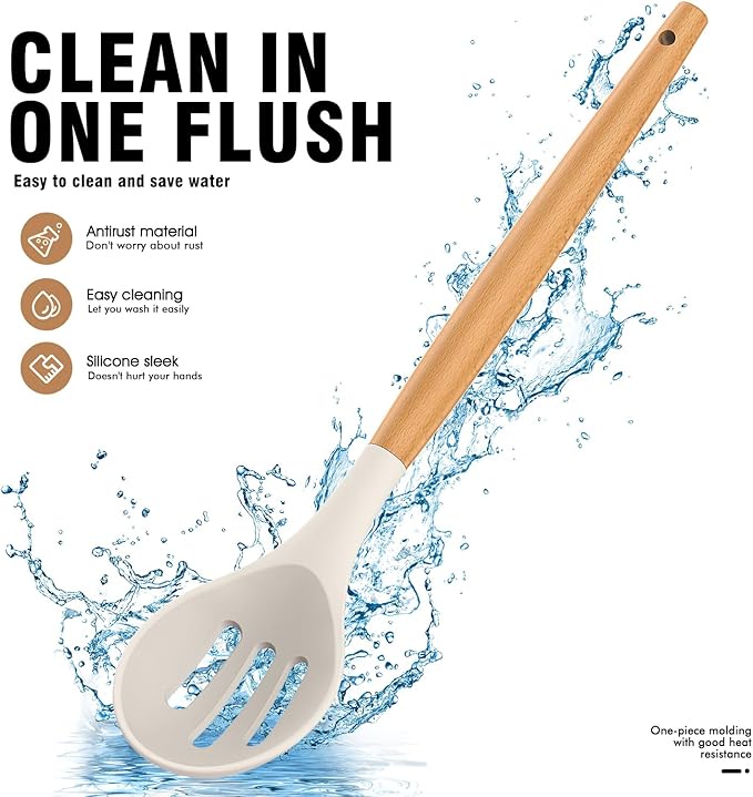 • NON-DEFORMABLE, EASY TO CLEAN: We've designed these silicone kitchen utensils sets with stainless steel cores wrapped in silicone for shape retention and flexibility. No warping or cracking, no hassle. The silicone utensils for coking one- piece construction ensures no pesky gaps where food can hide, making cleaning a breeze. Due to the unique nature of wooden handles, we recommend handwashing