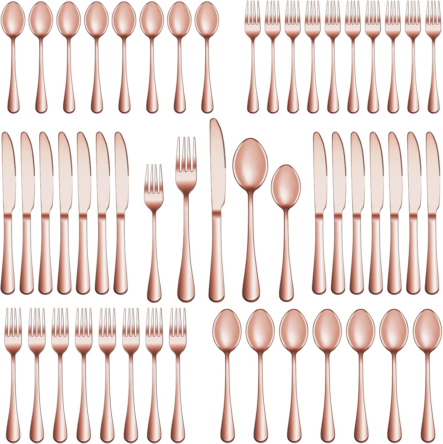 • 40 PCS ROSE GOLD SILVERWARE SET SERVICE FOR 8: This rose gold silverware set comes with 8 Dinner Forks, 8 Dinner Spoons, 8 Dinner Knife, 8 Salad/Dessert Fork and 8 Dessert/Tea Spoons, essential for families or restaurants. The set is also an irreplaceable dining tool whether it is for daily use or for preparing dinners or parties.
