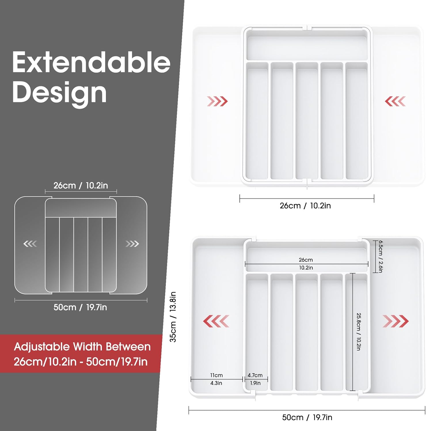 • ADJUSTABLE WIDTH: Tailor the AUJEN kitchen storage organizer to your specific needs with its ingenious retractable and removable design, making it an ideal fit for drawers of various sizes and shapes. This kitchen utensil organizer measures 10.2'' wide when folded while reaching 19.7'' when fully expanded.