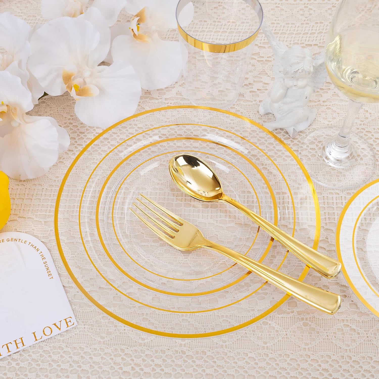• WHAT YOU GET: Our 700-piece disposable plastic utensils set is tailor-made for your 100-guest party.You will receive the 700 PCS disposable dinnerware set, including 100 clear gold dinner plates 10’’, 100 clear gold dessert plates 7’’, 100 gold plastic cups 10oz, 100 napkins,100 knives 7.8’’, 100 forks 7.4’’ and 100 spoons 6.8