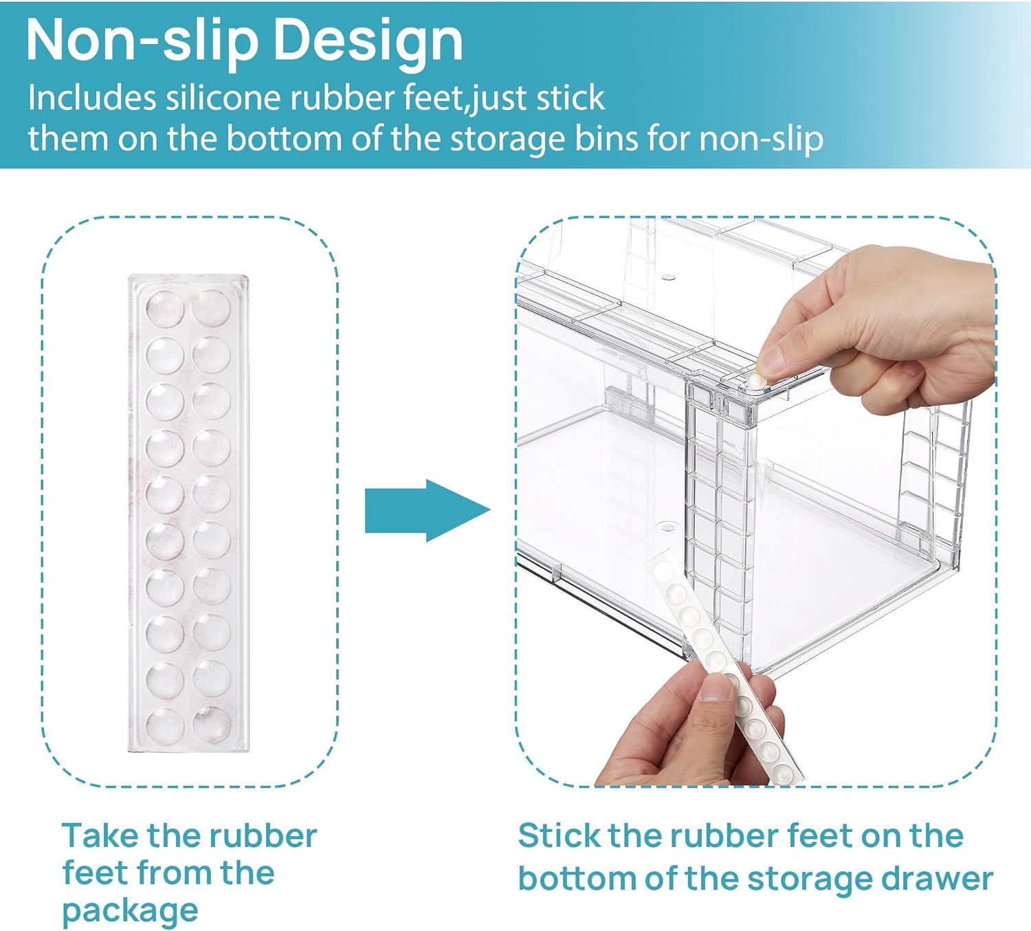 • Built-in Handle and Non-Slip--- Clear organizing containers are designed with pull-out handles, it is convenient to store and take out items.Extra silicone pads are included, add the rubber sticker dots to the bottom,our storage drawers slides in and out very effortlessly and outer frame don't move when pulled out the drawers