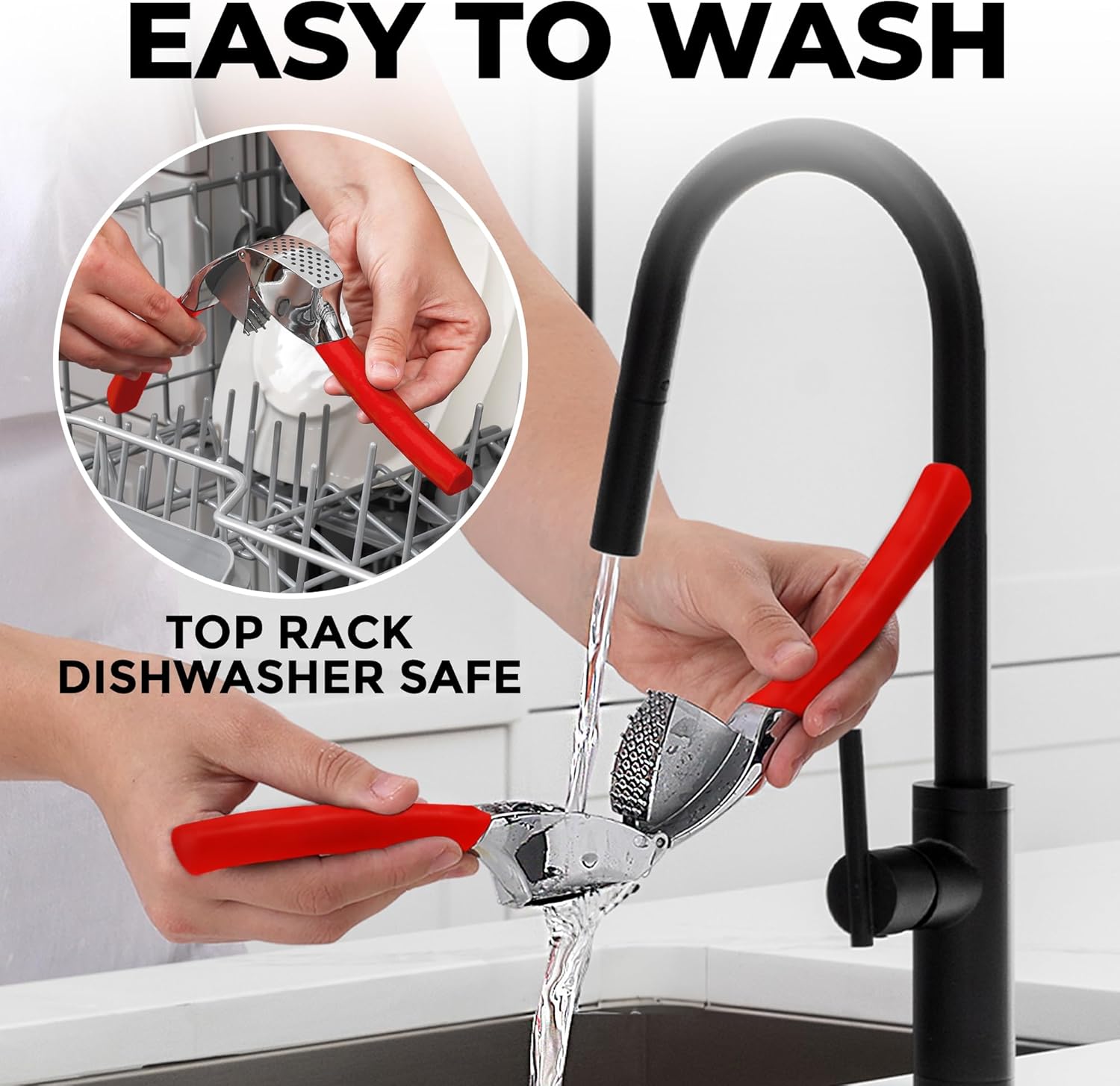 • EASY TO CLEAN: Simply rinse your garlic and ginger press tool under running water and use the included cleaning brush to get rid of any garlic bits or place it in the dishwasher for a quick clean up. Can be washed on the top rack dishwasher but hand wash is suggested. We recommend rinsing the garlic crusher right after use to avoid residual pulp and fibers hardening up.