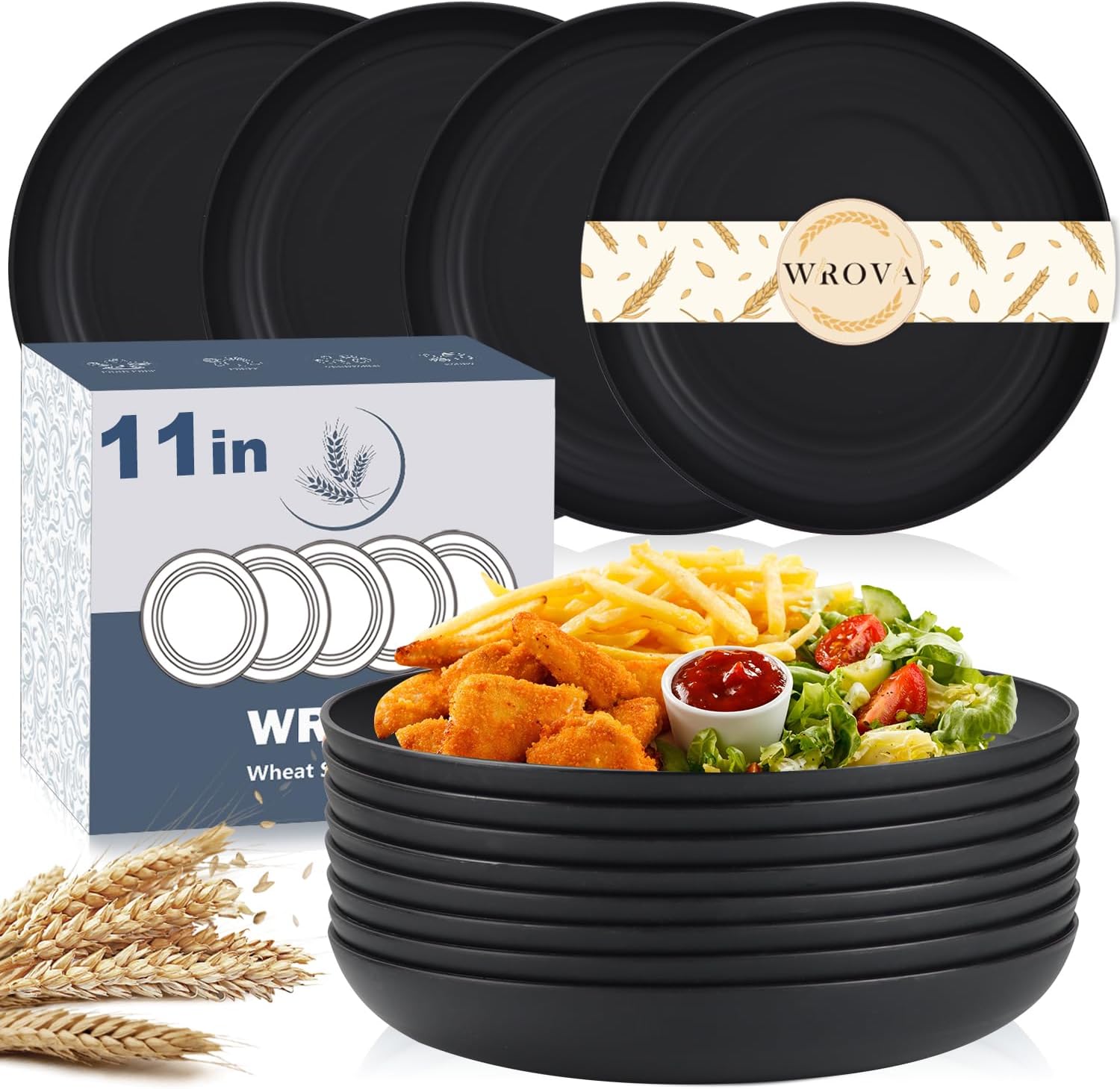 Wrova Large Wheat Straw Dinner Plates - 11 Inch Unbreakable Set of 8 - Dishwasher & Microwave Safe, Deep Edge for Kitchen and Camping (Black)