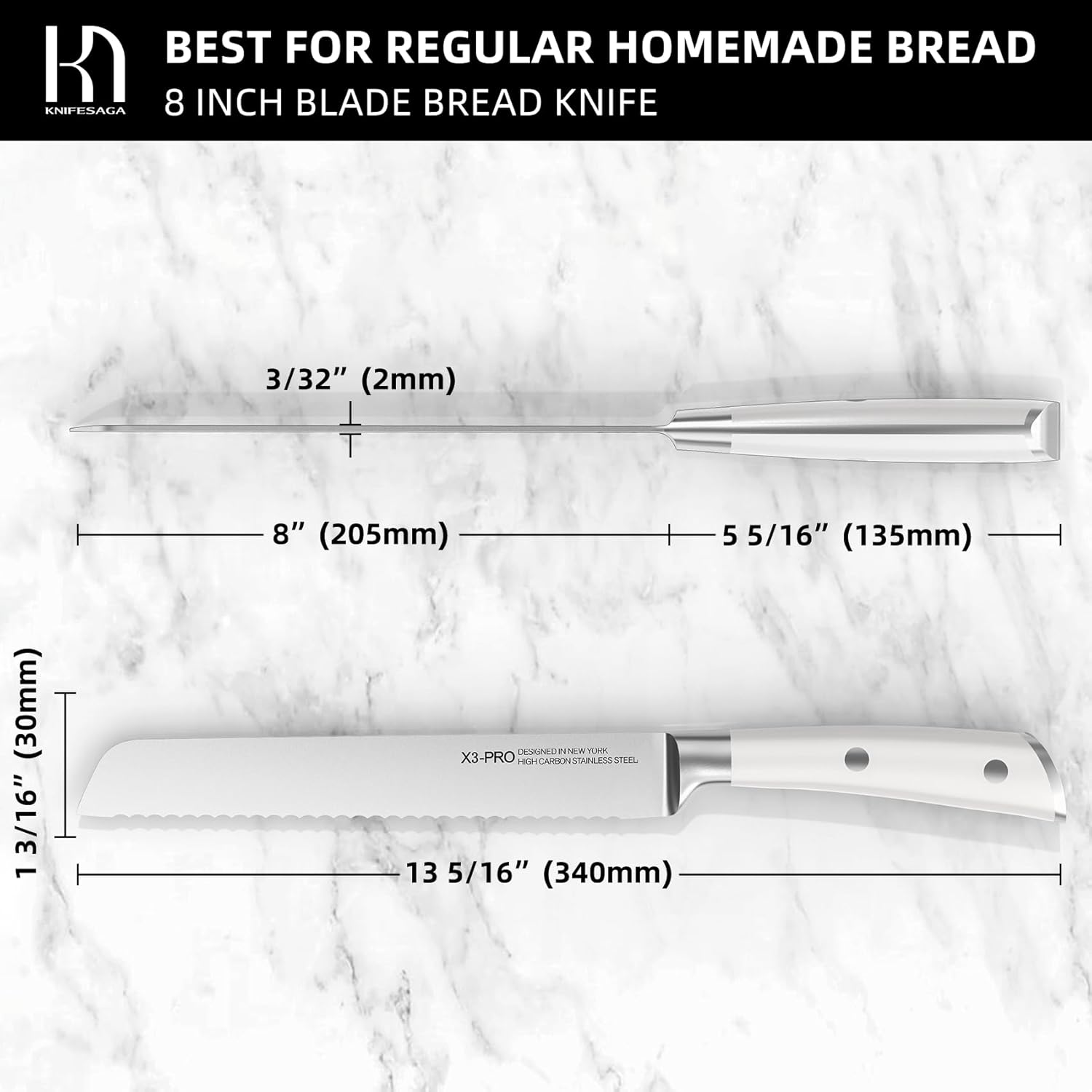 • 【Ultra-Sharp For Effortless And Efficient Cutting】KnifeSaga's unilateral serrated bread knife features tall pointy serrations for less friction and easier cutting. Less serrations ensure more power in each serration to bite into breads powerfully and precisely, guaranteeing effortless slicing through even the toughest loaves of bread. Enjoy crumb-free and tear-free bread effortlessly.