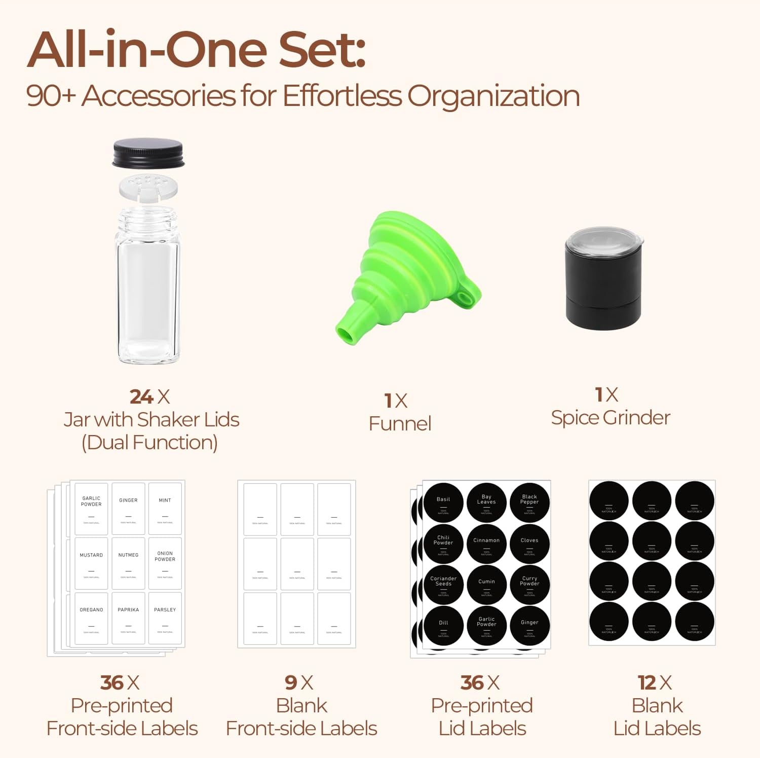 • Customizable Labeling: The set includes 93 labels in four distinct styles: black round, white square, and blank versions of each. Whether pre-labeled for quick identification or blank for your unique blends, organize your spices your way. Personalize your pantry with flair and function.