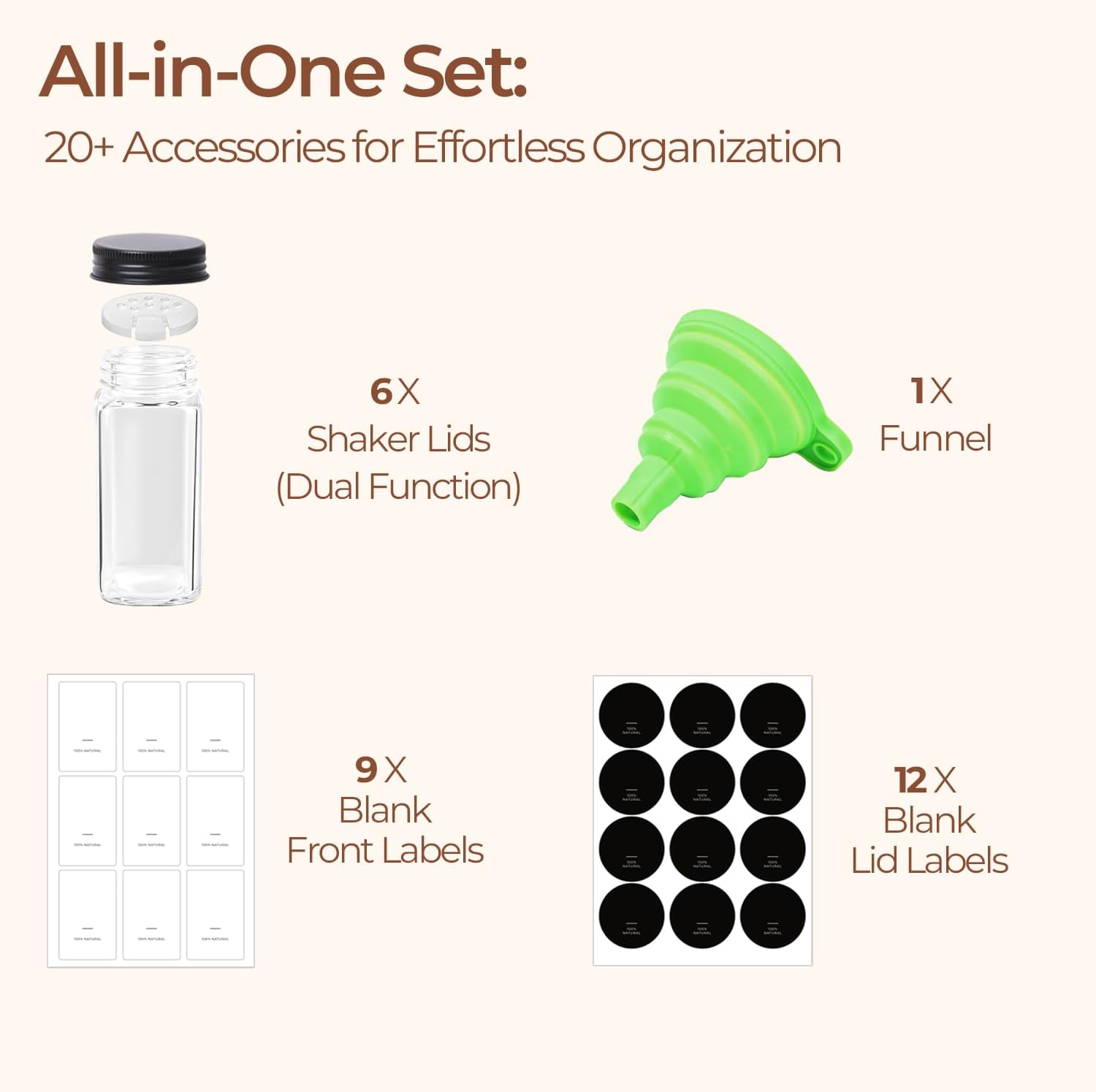 ComSaf 6Pcs 4oz Glass Spice Jars with Shaker Lids, 21 Labels, Spice Jars Trial Set & Supplement Set, Empty Spice Containers and Square Spice Bottles for Kitchen and Seasoning